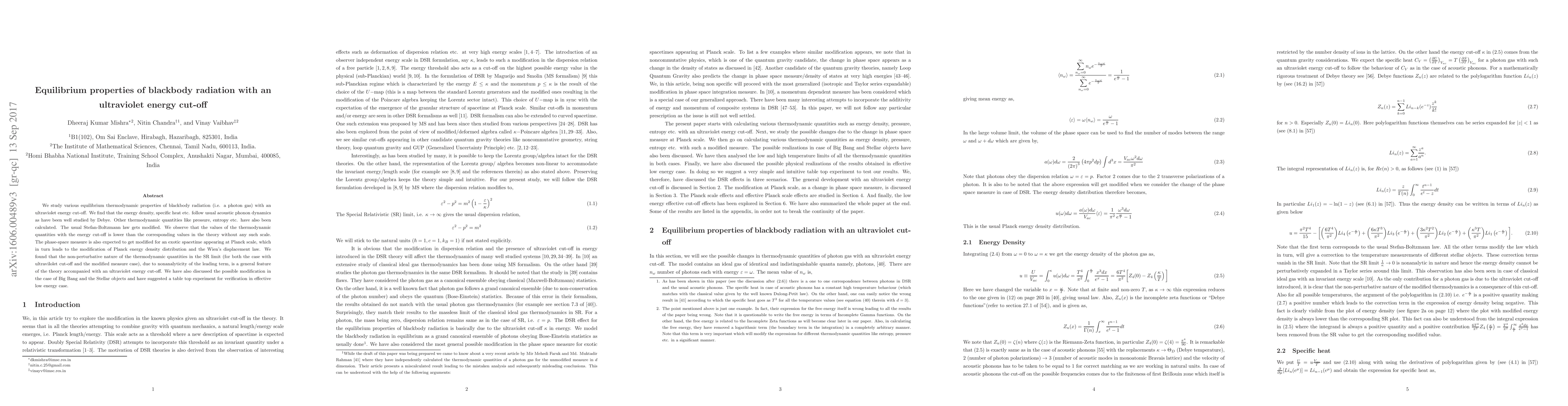 We study various equilibrium thermodynamic properties of blackbody radiation (i.e. a photon gas) with an ultraviolet energy cut-off. We find that the energy density, specific heat etc. follow usual acoustic phonon dynamics as have been well studied by Debye. Other thermodynamic quantities like pressure, entropy etc. have also been calculated. The usual Stefan-Boltzmann law gets modified. We observe that the values of the thermodynamic quantities with the energy cut-off is lower than the corresponding values in the theory without any such scale. The phase-space measure is also expected to get modified for an exotic spacetime appearing at Planck scale, which in turn leads to the modification of Planck energy density distribution and the Wien's displacement law. We found that the non-perturbative nature of the thermodynamic quantities in the SR limit (for both the case with ultravilolet cut-off and the modified measure case), due to nonanalyticity of the leading term, is a general feature of the theory accompanied with an ultraviolet energy cut-off. We have also discussed the possible modification in the case of Big Bang and the Stellar objects and have suggested a table top experiment for verification in effective low energy case.