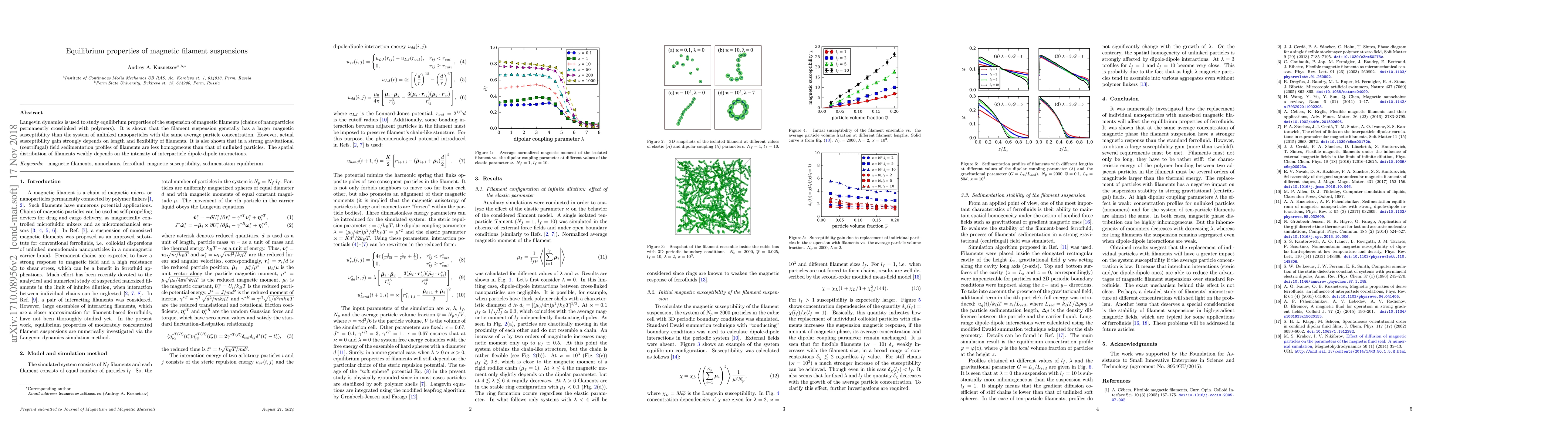 A study using Langevin dynamics found that magnetic filament suspensions exhibit larger susceptibility than unlinked nanoparticles but this gain depends on filament length and flexibility. The spatial distribution of filaments also varies depending on gravitational field intensity and interparticle interactions.
