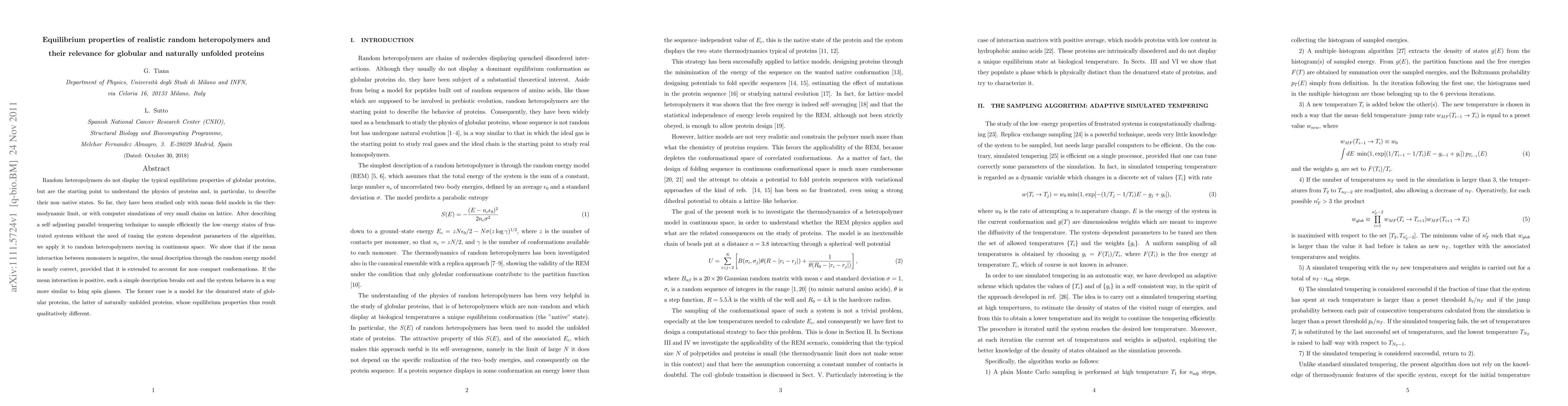 Random heteropolymers do not display the typical equilibrium properties of globular proteins, but are the starting point to understand the physics of proteins and, in particular, to describe their non-native states. So far, they have been studied only with mean-field models in the thermodynamic limit, or with computer simulations of very small chains on lattice. After describing a self-adjusting parallel-tempering technique to sample efficiently the low-energy states of frustrated systems without the need of tuning the system-dependent parameters of the algorithm, we apply it to random heteropolymers moving in continuous space. We show that if the mean interaction between monomers is negative, the usual description through the random energy model is nearly correct, provided that it is extended to account for non-compact conformations. If the mean interaction is positive, such a simple description breaks out and the system behaves in a way more similar to Ising spin glasses. The former case is a model for the denatured state of glob- ular proteins, the latter of naturally-unfolded proteins, whose equilibrium properties thus result qualitatively different.