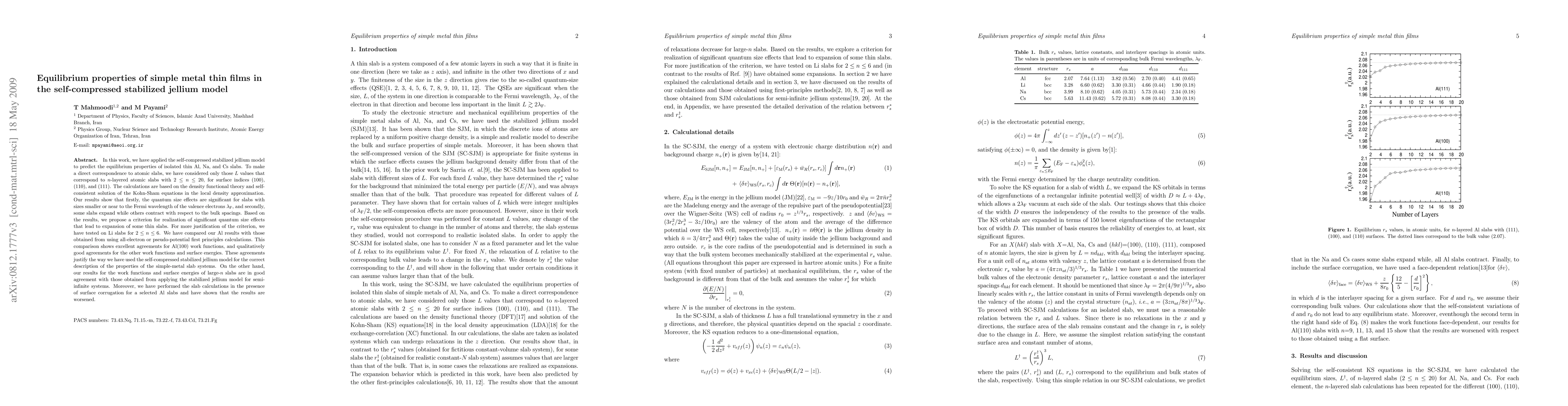 This paper uses the self-compressed stabilized jellium model to predict equilibrium properties of thin Al, Na, and Cs slabs, revealing significant quantum size effects for slabs near the Fermi wavelength and differing expansion/contraction behaviors. The model's accuracy is validated through comparisons with all-electron calculations and agreements with established jellium models.