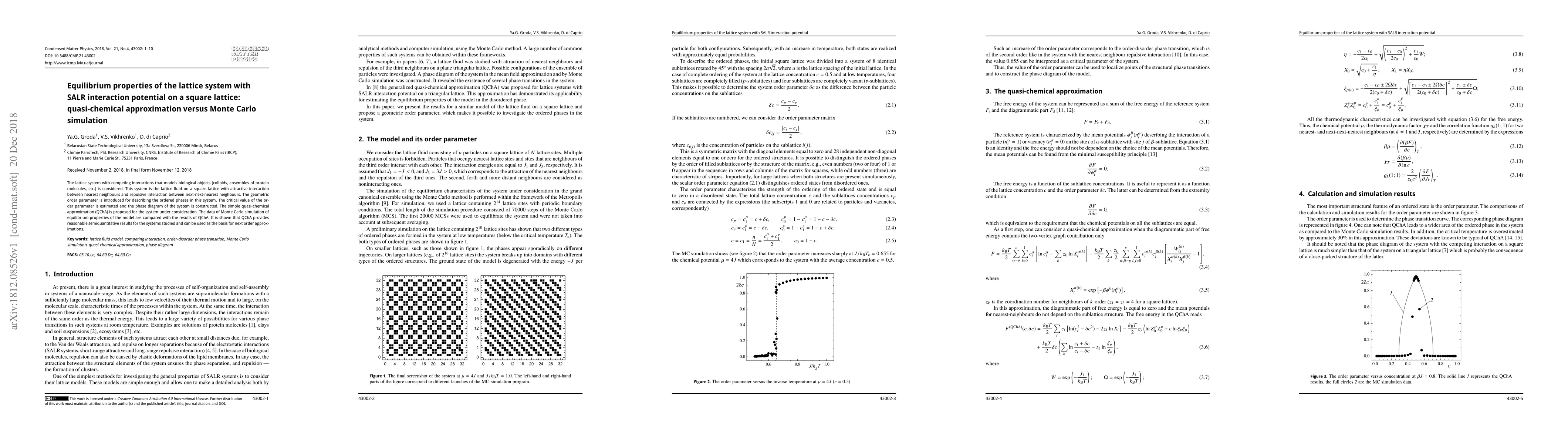 The lattice system with competing interactions that models biological objects (colloids, ensembles of protein molecules, etc.) is considered. This system is the lattice fluid on a square lattice with attractive interaction between nearest neighbours and repulsive interaction between next-next-nearest neighbours. The geometric order parameter is introduced for describing the ordered phases in this system. The critical value of the order parameter is estimated and the phase diagram of the system is constructed. The simple quasi-chemical approximation (QChA) is proposed for the system under consideration. The data of Monte Carlo simulation of equilibrium properties of the model are compared with the results of QChA. It is shown that QChA provides reasonable semiquantitative results for the systems studied and can be used as the basis for next order approximations.