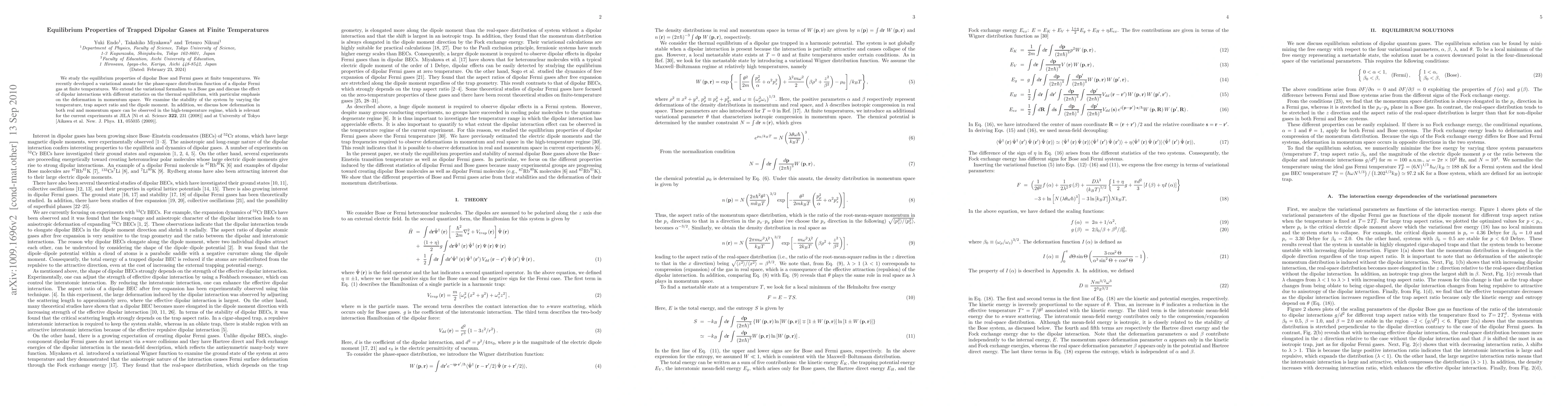 This paper investigates the equilibrium properties of dipolar Bose and Fermi gases at finite temperatures, extending a variational ansatz to both gases and examining the impact of dipolar interactions on thermal equilibrium. It also explores the stability of the system under varying conditions and discusses observable deformations in real and momentum space relevant for current experimental setups.