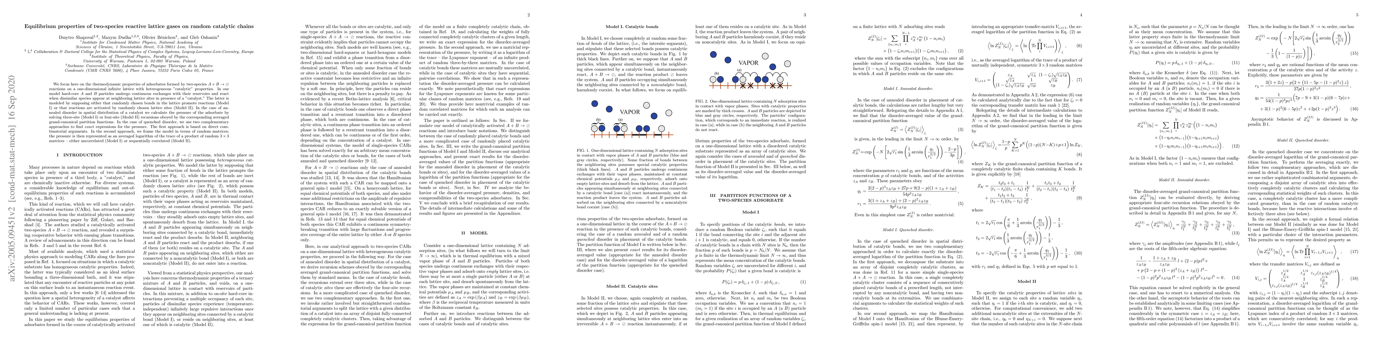 We focus here on the thermodynamic properties of adsorbates formed by two-species $A+B \to \oslash$ reactions on a one-dimensional infinite lattice with heterogeneous "catalytic" properties. In our model hard-core $A$ and $B$ particles undergo continuous exchanges with their reservoirs and react when dissimilar species appear at neighboring lattice sites in presence of a "catalyst." The latter is modeled by supposing either that randomly chosen bonds in the lattice promote reactions (Model I) or that reactions are activated by randomly chosen lattice sites (Model II). In the case of annealed disorder in spatial distribution of a catalyst we calculate the pressure of the adsorbate by solving three-site (Model I) or four-site (Model II) recursions obeyed by the corresponding averaged grand-canonical partition functions. In the case of quenched disorder, we use two complementary approaches to find $\textit{exact}$ expressions for the pressure. The first approach is based on direct combinatorial arguments. In the second approach, we frame the model in terms of random matrices; the pressure is then represented as an averaged logarithm of the trace of a product of random $3 \times 3$ matrices -- either uncorrelated (Model I) or sequentially correlated (Model II).