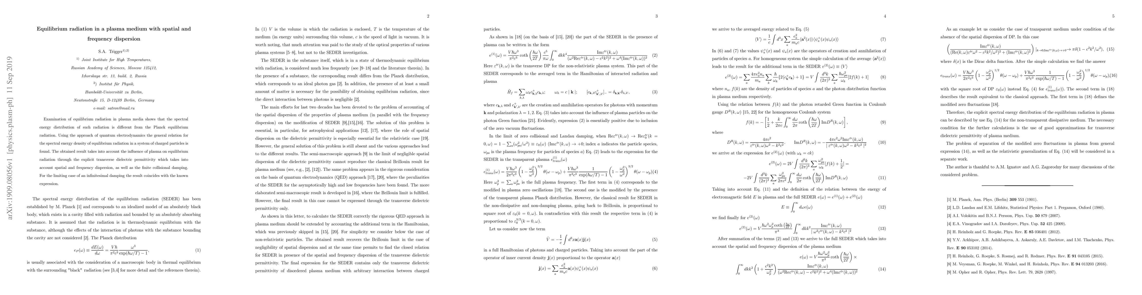 This paper investigates equilibrium radiation in plasma media, revealing a spectral energy distribution distinct from Planck radiation. It derives a general relation for the spectral energy density using quantum electrodynamics, considering spatial and frequency dispersion and finite collisional damping through the transverse dielectric permittivity.
