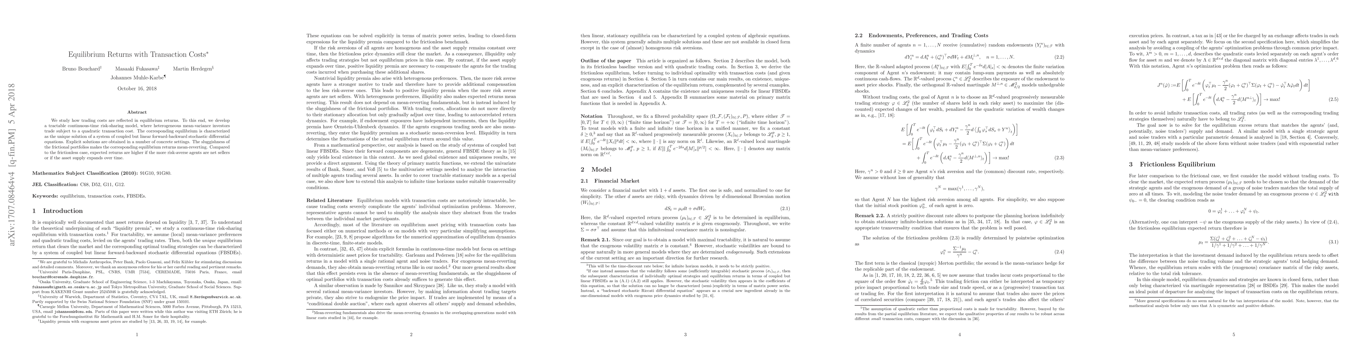 This study examines how trading costs affect equilibrium returns in a continuous-time risk-sharing model. It finds that frictional portfolios lead to mean-reverting returns and higher expected returns under certain conditions.