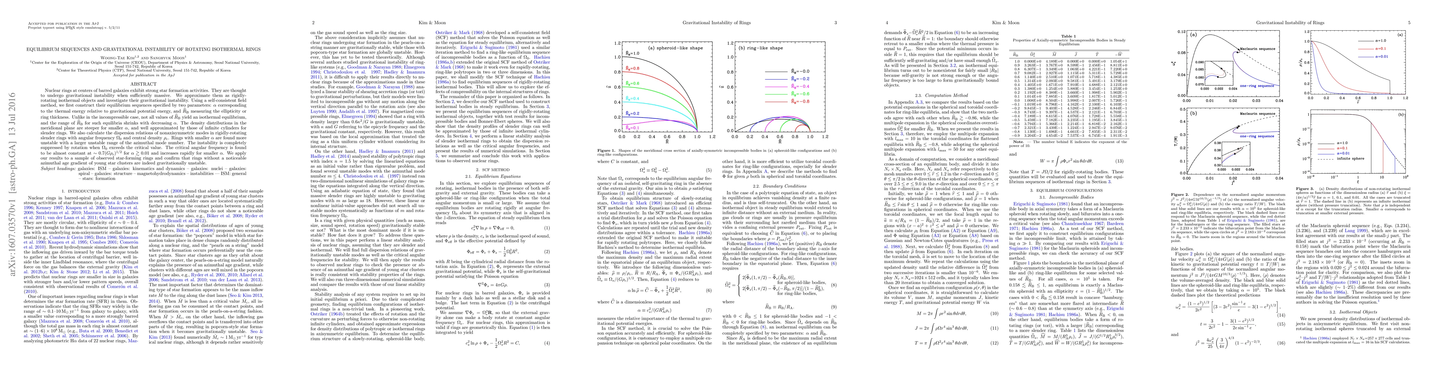 Nuclear rings at centers of barred galaxies exhibit strong star formation activities. They are thought to undergo gravitational instability when sufficiently massive. We approximate them as rigidly-rotating isothermal objects and investigate their gravitational instability. Using a self-consistent field method, we first construct their equilibrium sequences specified by two parameters: alpha corresponding to the thermal energy relative to gravitational potential energy, and R_B measuring the ellipticity or ring thickness. Unlike in the incompressible case, not all values of R_B yield an isothermal equilibrium, and the range of R_B for such equilibria shrinks with decreasing alpha. The density distributions in the meridional plane are steeper for smaller alpha, and well approximated by those of infinite cylinders for slender rings. We also calculate the dispersion relations of nonaxisymmetric modes in rigidly-rotating slender rings with angular frequency Omega_0 and central density rho_max. Rings with smaller alpha are found more unstable with a larger unstable range of the azimuthal mode number. The instability is completely suppressed by rotation when Omega_0 exceeds the critical value. The critical angular frequency is found to be almost constant at ~ 0.7 sqrt(G*rho_c) for alpha > 0.01 and increases rapidly for smaller alpha. We apply our results to a sample of observed star-forming rings and confirm that rings without a noticeable azimuthal age gradient of young star clusters are indeed gravitationally unstable.