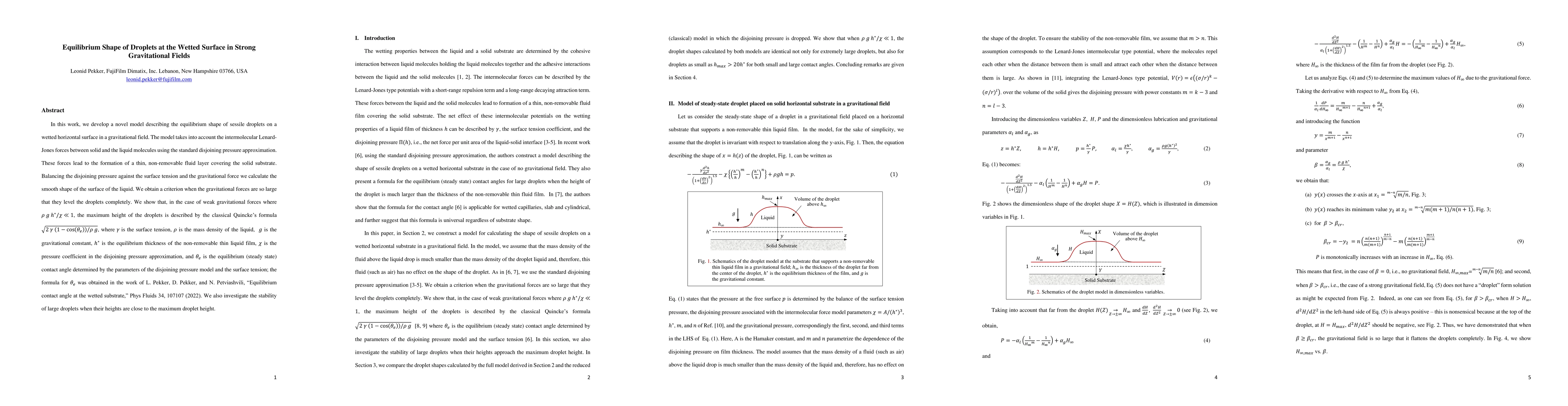 This paper develops a model to describe the equilibrium shape of sessile droplets on wetted surfaces under strong gravitational fields, incorporating intermolecular forces and disjoining pressure. It finds that large gravitational forces can flatten droplets, while weak forces follow the classical Quincke formula for maximum height.