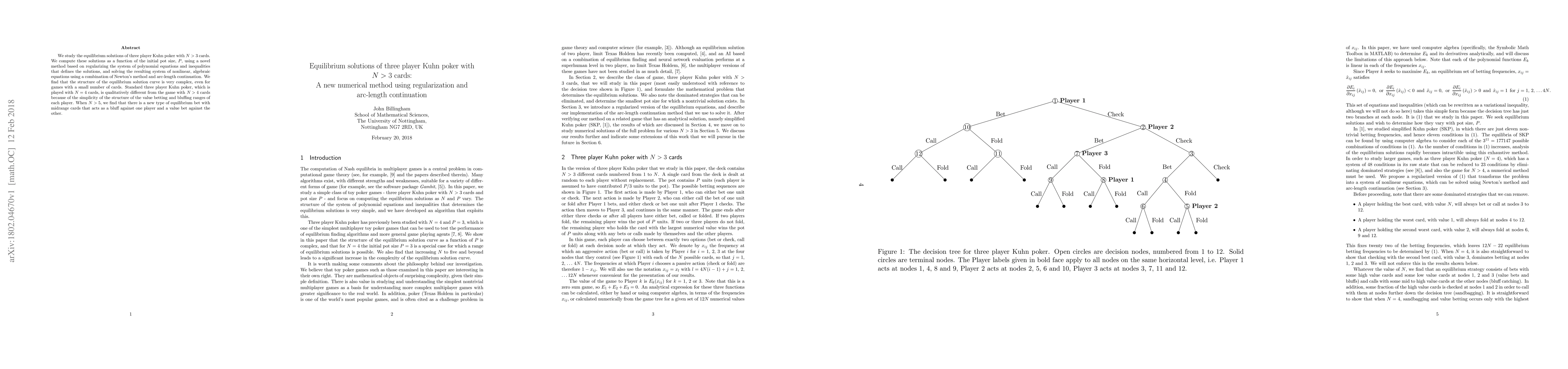 We study the equilibrium solutions of three player Kuhn poker with $N>3$ cards. We compute these solutions as a function of the initial pot size, $P$, using a novel method based on regularizing the system of polynomial equations and inequalities that defines the solutions, and solving the resulting system of nonlinear, algebraic equations using a combination of Newton's method and arc-length continuation. We find that the structure of the equilibrium solution curve is very complex, even for games with a small number of cards. Standard three player Kuhn poker, which is played with $N=4$ cards, is qualitatively different from the game with $N>4$ cards because of the simplicity of the structure of the value betting and bluffing ranges of each player. When $N>5$, we find that there is a new type of equilibrium bet with midrange cards that acts as a bluff against one player and a value bet against the other.