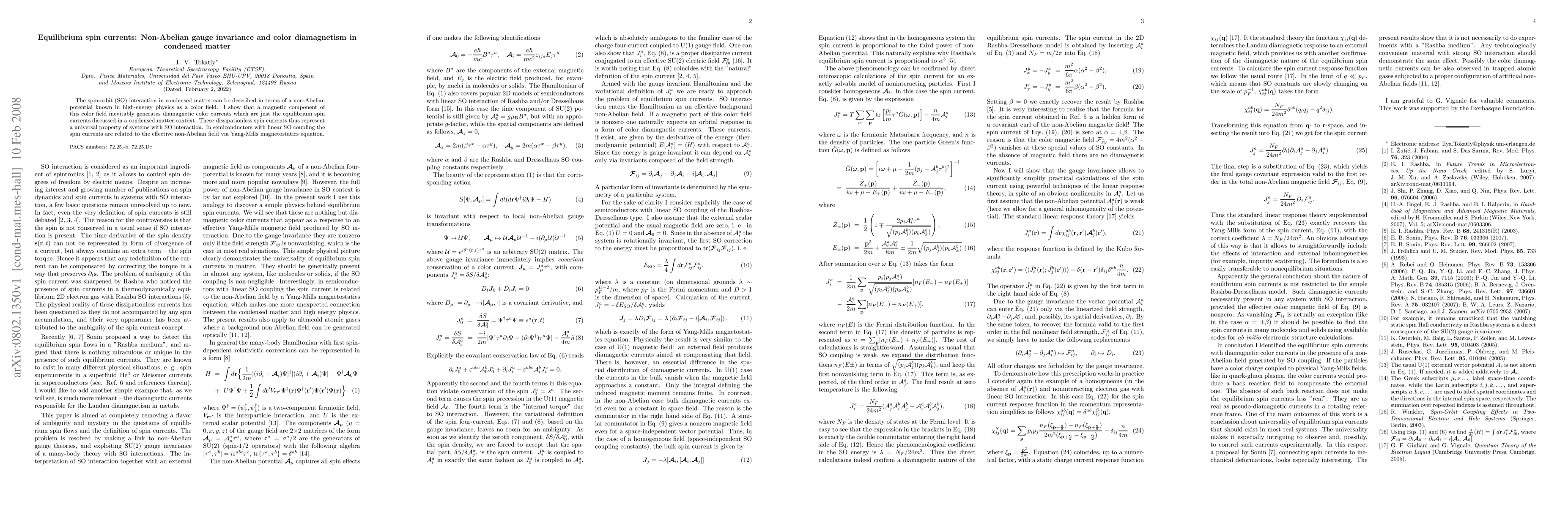 This paper explores the spin-orbit interaction in condensed matter through a non-Abelian gauge theory framework, demonstrating that a magnetic component of a color field induces diamagnetic color currents, which are equivalent to equilibrium spin currents. These dissipationless spin currents are shown to be a universal feature of systems with spin-orbit coupling.
