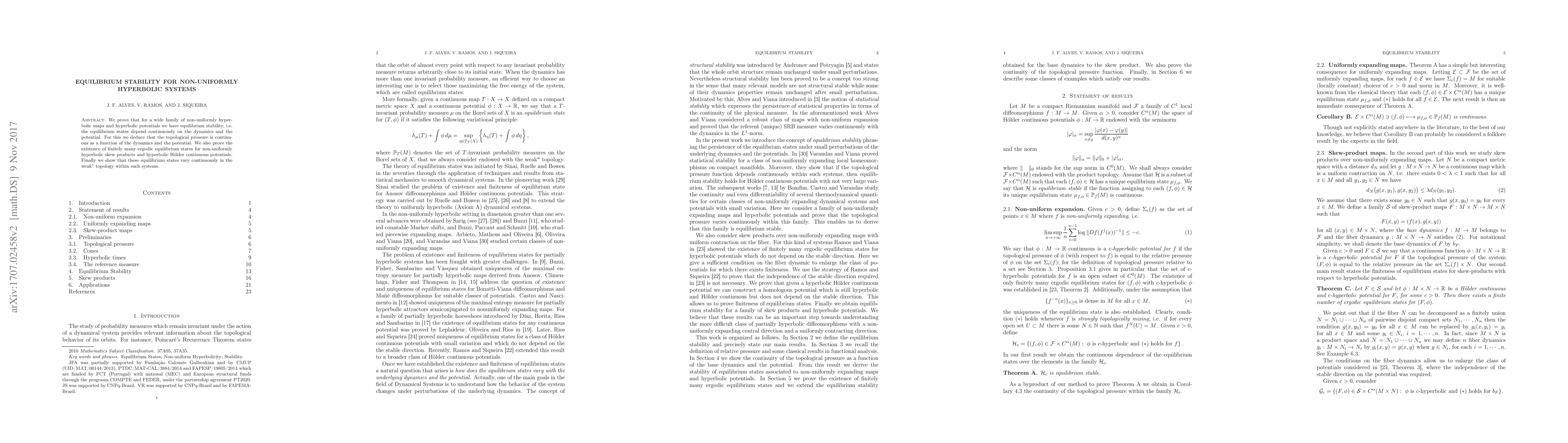 The research employs techniques from dynamical systems theory, specifically focusing on non-uniformly hyperbolic systems. It proves equilibrium stability for a wide family of such systems and hyperbolic potentials, demonstrating that equilibrium states depend continuously on the dynamics and potential.