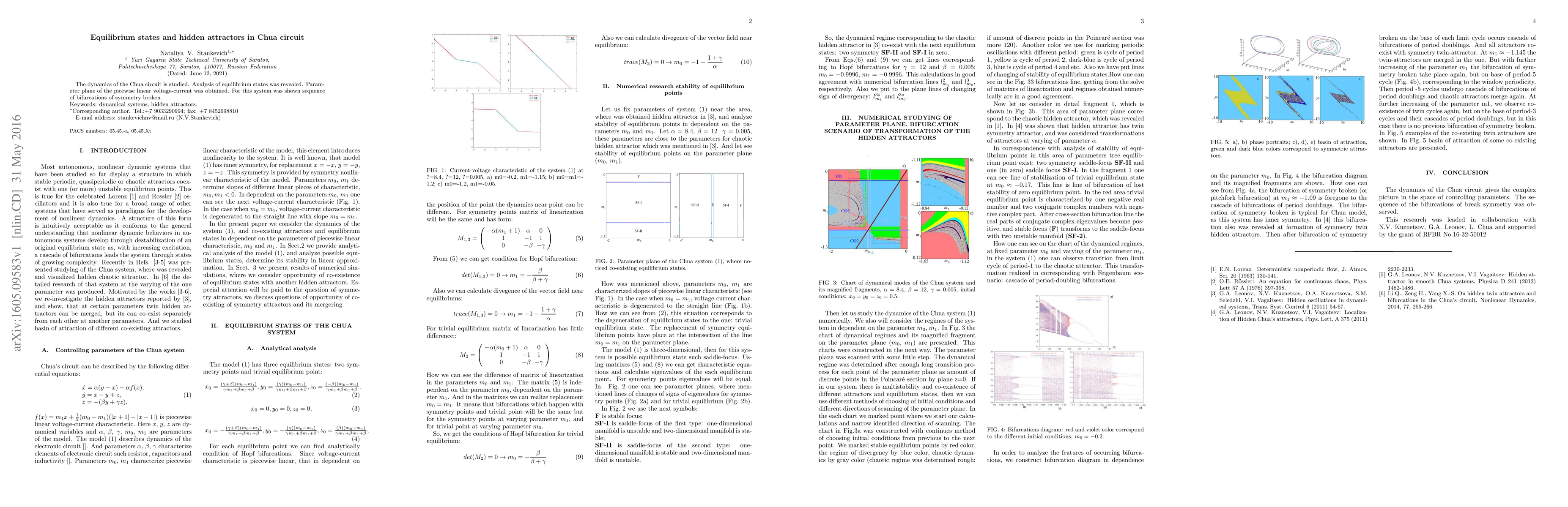 Summary: This paper explores the dynamics of the Chua circuit, revealing its equilibrium states and identifying a parameter plane for piecewise linear voltage-current. It demonstrates a sequence of symmetry-breaking bifurcations in the system, highlighting the presence of hidden attractors.
