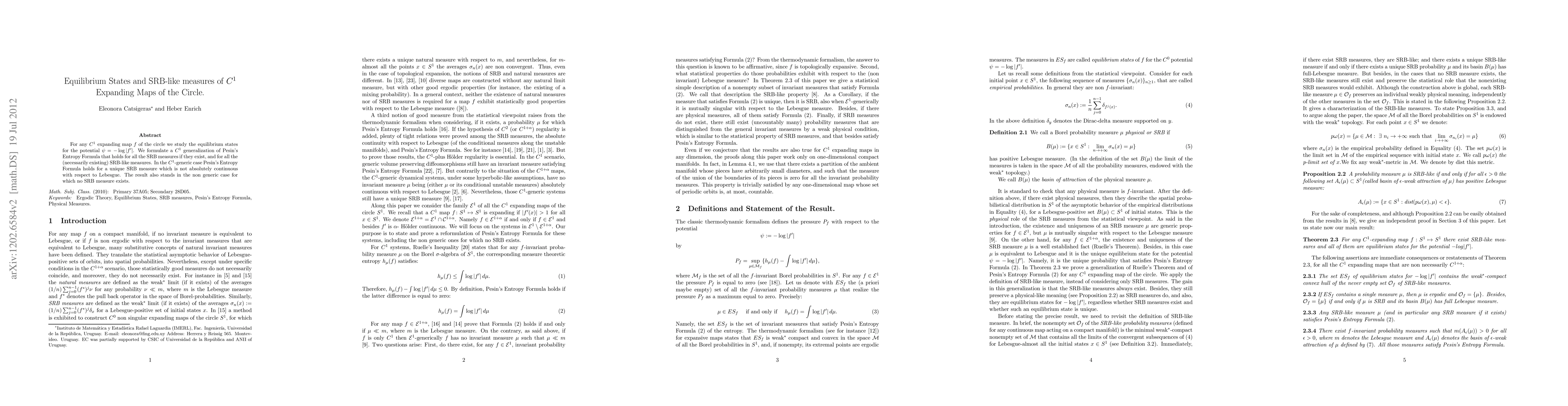 This paper investigates equilibrium states for C1 expanding maps of the circle under the potential -log |f'|, presenting a C1 generalization of Pesin's Entropy Formula applicable to SRB-like measures, and demonstrating its validity even when traditional SRB measures do not exist. The unique SRB measure, when present, is shown to be non-absolutely continuous with respect to Lebesgue measure.