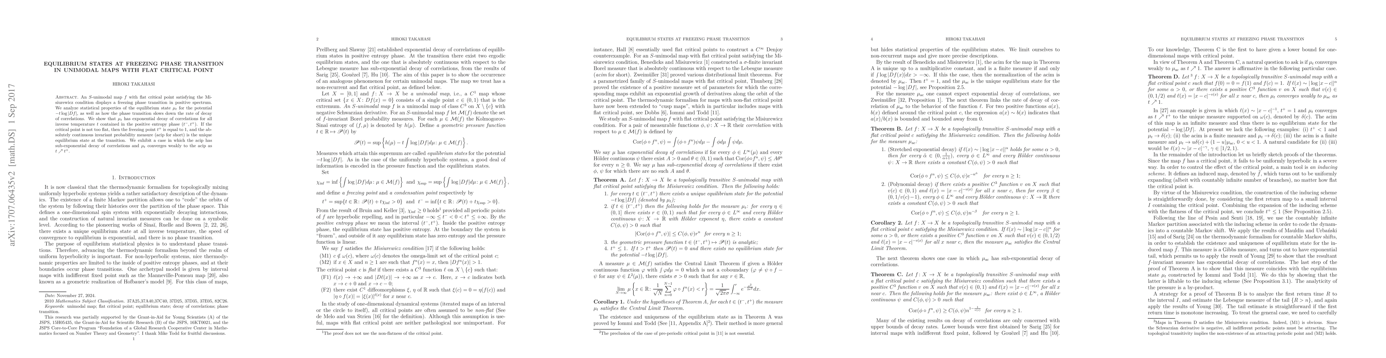 This paper investigates the statistical properties of equilibrium states in unimodal maps with a flat critical point undergoing a freezing phase transition. It shows that the equilibrium state exhibits exponential decay of correlations for positive entropy temperatures, and when the critical point is not excessively flat, the transition uniquely determines the absolutely continuous invariant probability measure, which may have sub-exponential decay of correlations.
