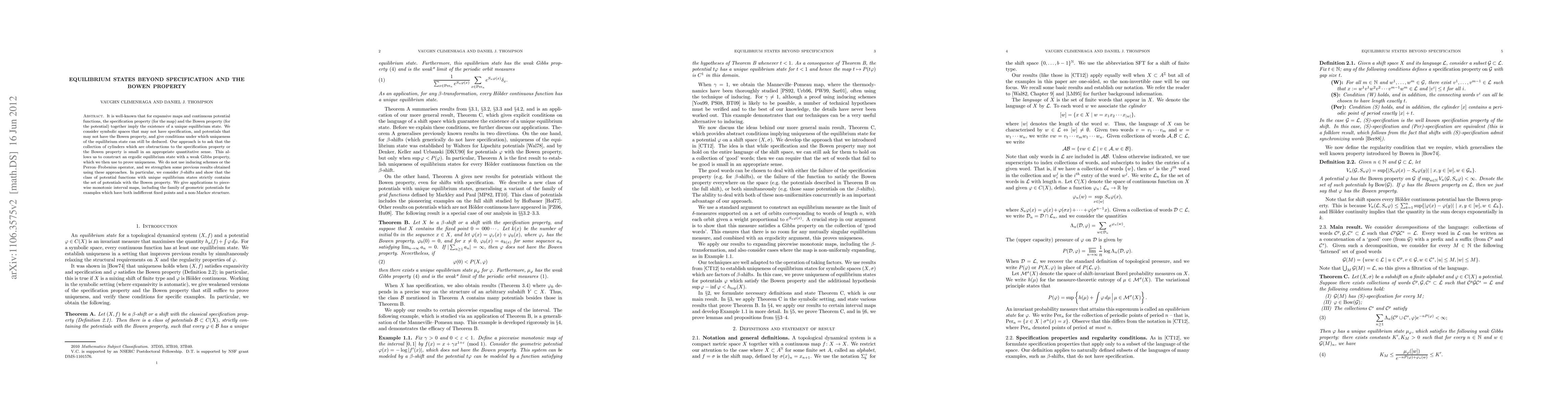 It is well-known that for expansive maps and continuous potential functions, the specification property (for the map) and the Bowen property (for the potential) together imply the existence of a unique equilibrium state. We consider symbolic spaces that may not have specification, and potentials that may not have the Bowen property, and give conditions under which uniqueness of the equilibrium state can still be deduced. Our approach is to ask that the collection of cylinders which are obstructions to the specification property or the Bowen property is small in an appropriate quantitative sense. This allows us to construct an ergodic equilibrium state with a weak Gibbs property, which we then use to prove uniqueness. We do not use inducing schemes or the Perron--Frobenius operator, and we strengthen some previous results obtained using these approaches. In particular, we consider $\beta$-shifts and show that the class of potential functions with unique equilibrium states strictly contains the set of potentials with the Bowen property. We give applications to piecewise monotonic interval maps, including the family of geometric potentials for examples which have both indifferent fixed points and a non-Markov structure.