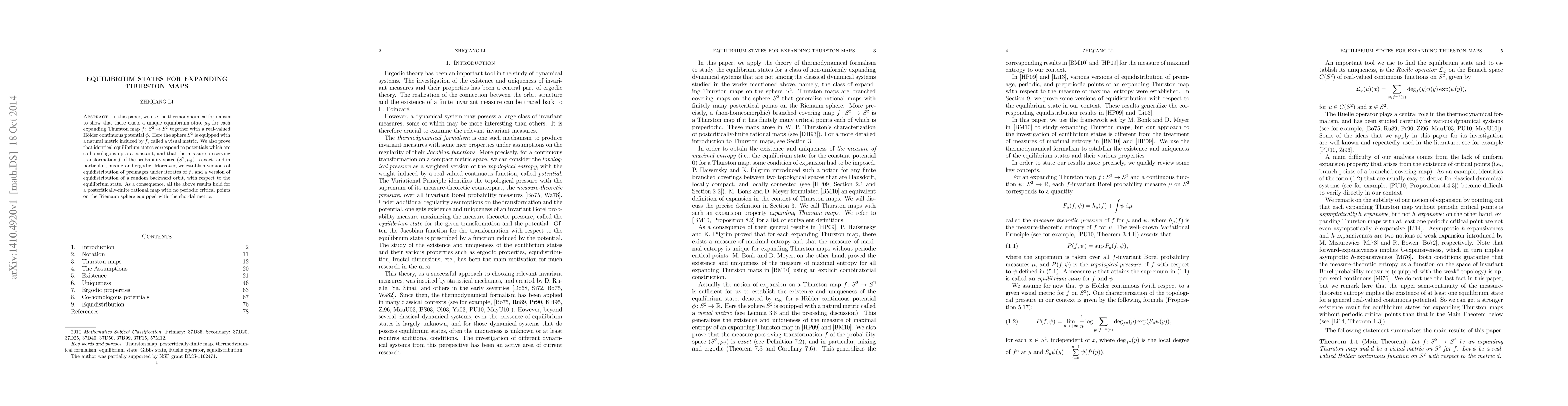 In this paper, we use the thermodynamical formalism to show that there exists a unique equilibrium state $\mu_\phi$ for each expanding Thurston map $f: S^2\rightarrow S^2$ together with a real-valued H\"older continuous potential $\phi$. Here the sphere $S^2$ is equipped with a natural metric induced by $f$, called a visual metric. We also prove that identical equilibrium states correspond to potentials which are co-homologous upto a constant, and that the measure-preserving transformation $f$ of the probability space $(S^2,\mu_\phi)$ is exact, and in particular, mixing and ergodic. Moreover, we establish versions of equidistribution of preimages under iterates of $f$, and a version of equidistribution of a random backward orbit, with respect to the equilibrium state. As a consequence, all the above results hold for a postcritically-finite rational map with no periodic critical points on the Riemann sphere equipped with the chordal metric.