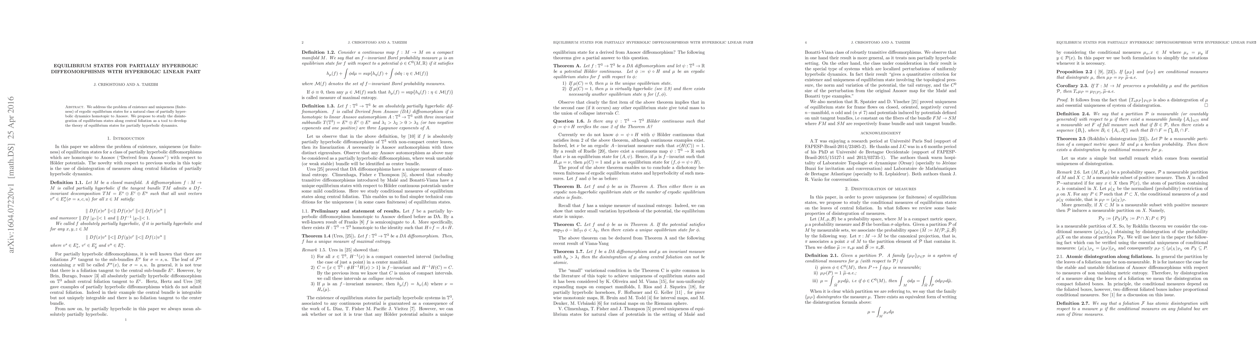 This paper investigates the existence and uniqueness of ergodic equilibrium states for a class of partially hyperbolic diffeomorphisms with hyperbolic linear parts, proposing the disintegration of equilibrium states along central foliations as a method to advance the theory of such dynamics.