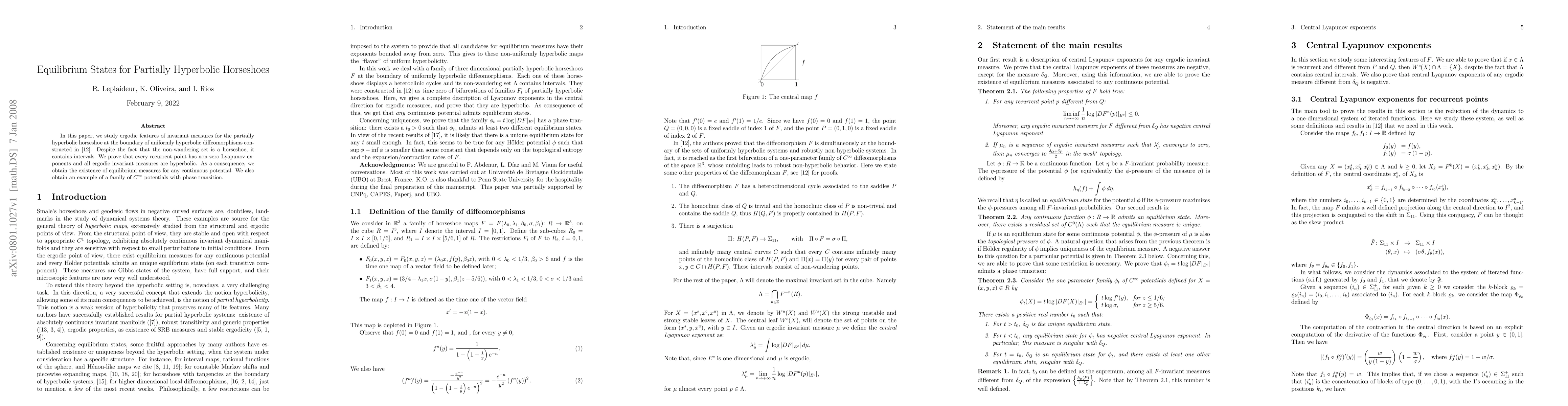 In this paper, we study ergodic features of invariant measures for the partially hyperbolic horseshoe at the boundary of uniformly hyperbolic diffeomorphisms constructed in \cite{DHRS07}. Despite the fact that the non-wandering set is a horseshoe, it contains intervals. We prove that every recurrent point has non-zero Lyapunov exponents and all ergodic invariant measures are hyperbolic. As a consequence, we obtain the existence of equilibrium measures for any continuous potential. We also obtain an example of a family of $C^\infty$ potentials with phase transition.