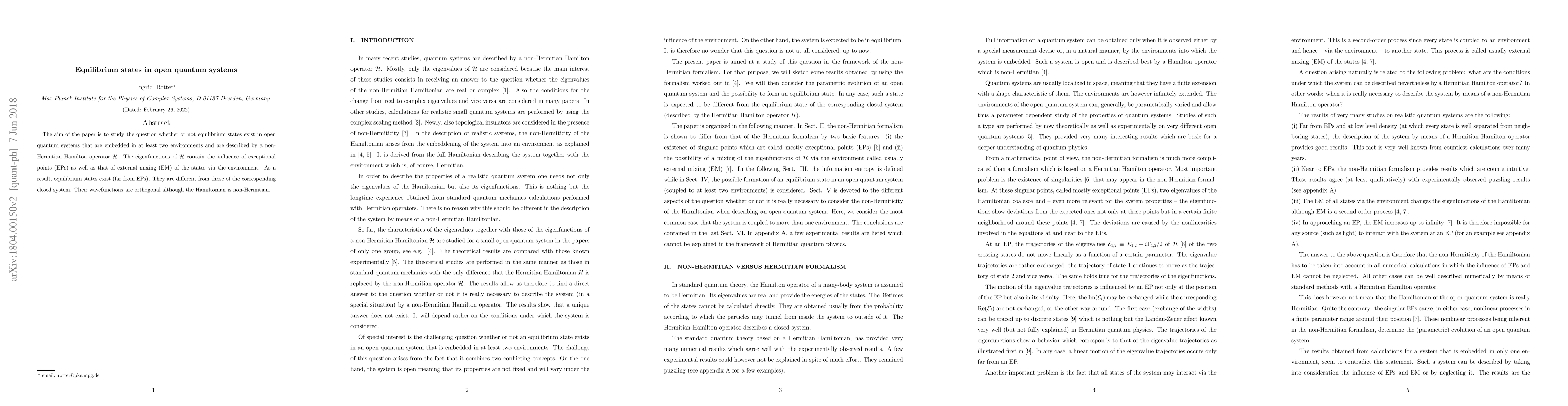 The aim of the paper is to study the question whether or not equilibrium states exist in open quantum systems that are embedded in at least two environments and are described by a non-Hermitian Hamilton operator $\cal H$. The eigenfunctions of $\cal H$ contain the influence of exceptional points (EPs) as well as that of external mixing (EM) of the states via the environment. As a result, equilibrium states exist (far from EPs). They are different from those of the corresponding closed system. Their wavefunctions are orthogonal although the Hamiltonian is non-Hermitian.