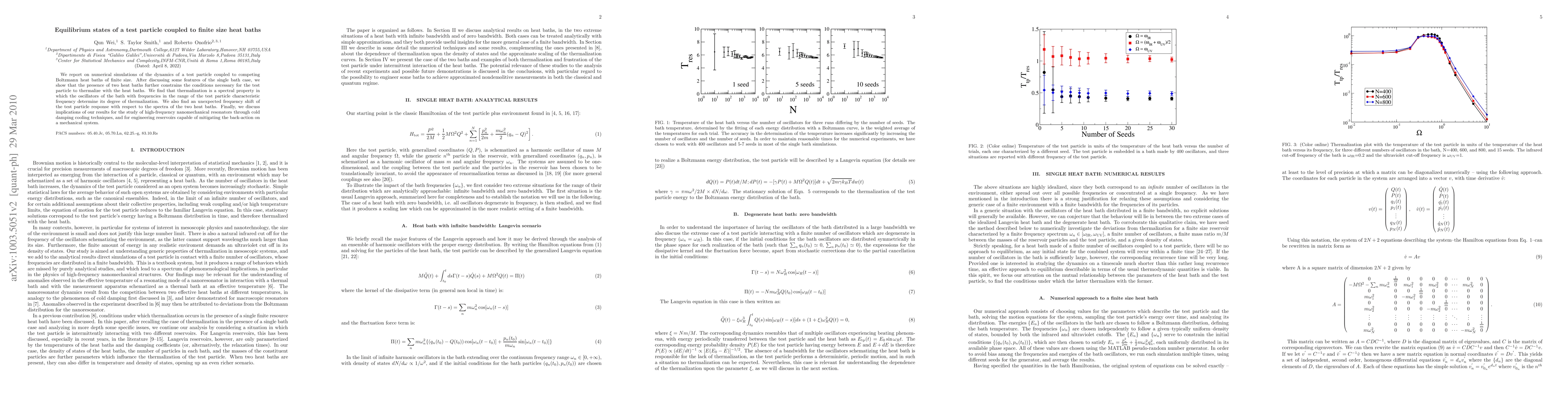 This paper investigates the dynamics of a test particle coupled to two finite-size heat baths, revealing that thermalization depends on the frequency range of the bath oscillators. It also uncovers an unexpected frequency shift in the test particle's response, with implications for nanomechanical resonators and damping cooling techniques.