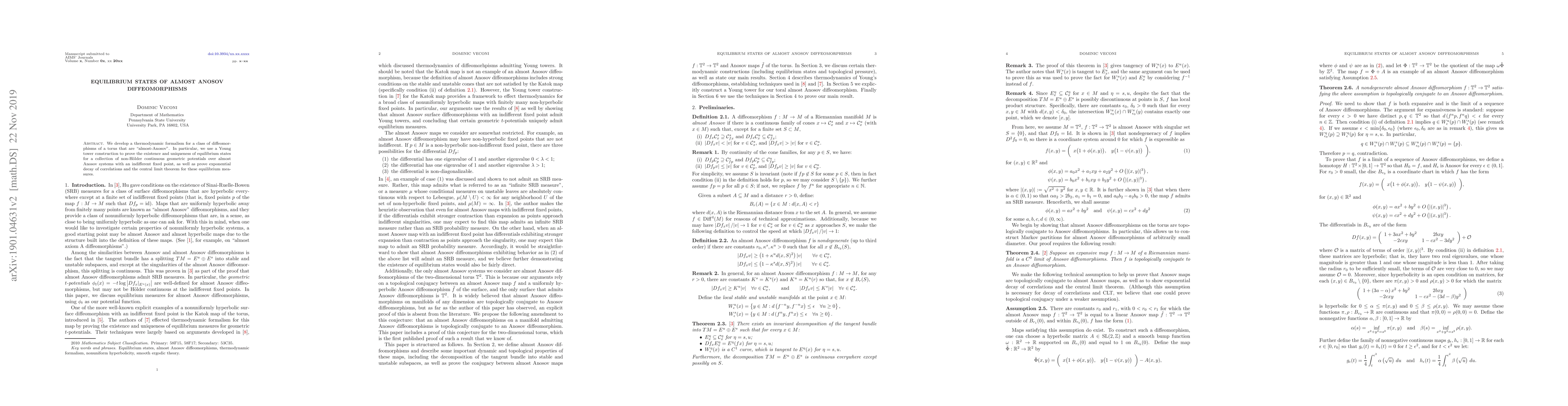 This paper develops a thermodynamic formalism for almost-Anosov diffeomorphisms on a torus, proving the existence and uniqueness of equilibrium states for certain systems with indifferent fixed points.