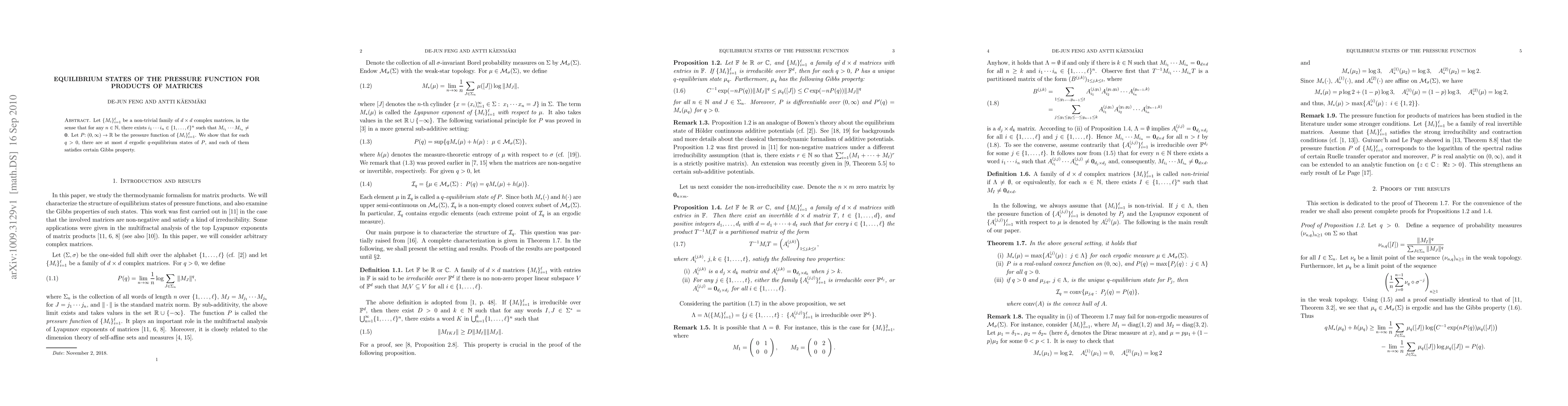 Let $\{M_i\}_{i=1}^\ell$ be a non-trivial family of $d\times d$ complex matrices, in the sense that for any $n\in \N$, there exists $i_1... i_n\in \{1,..., \ell\}^n$ such that $M_{i_1}... M_{i_n}\neq {\bf 0}$. Let $P \colon (0,\infty)\to \R$ be the pressure function of $\{M_i\}_{i=1}^\ell$. We show that for each $q>0$, there are at most $d$ ergodic $q$-equilibrium states of $P$, and each of them satisfies certain Gibbs property.