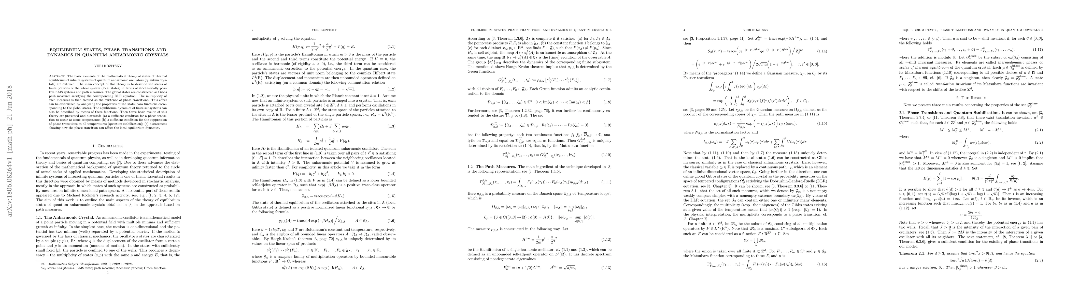 The basic elements of the mathematical theory of states of thermal equilibrium of infinite systems of quantum anharmonic oscillators (quantum crystals) are outlined. The main concept of this theory is to describe the states of finite portions of the whole system (local states) in terms of stochastically positive KMS systems and path measures. The global states are constructed as Gibbs path measures satisfying the corresponding DLR equation. The multiplicity of such measures is then treated as the existence of phase transitions. This effect can be established by analyzing the properties of the Matsubara functions corresponding to the global states. The equilibrium dynamics of finite subsystems can also be described by means of these functions. Then three basic results of this theory are presented and discussed: (a) a sufficient condition for a phase transition to occur at some temperature; (b) a sufficient condition for the suppression of phase transitions at all temperatures (quantum stabilization); (c) a statement showing how the phase transition can affect the local equilibrium dynamics.