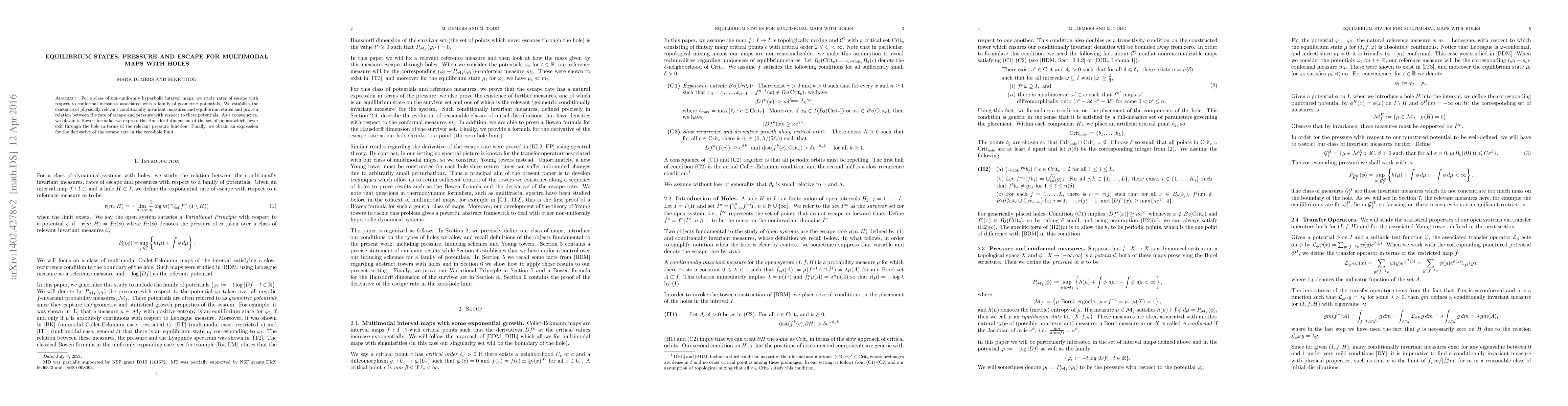 For a class of non-uniformly hyperbolic interval maps, we study rates of escape with respect to conformal measures associated with a family of geometric potentials. We establish the existence of physically relevant conditionally invariant measures and equilibrium states and prove a relation between the rate of escape and pressure with respect to these potentials. As a consequence, we obtain a Bowen formula: we express the Hausdorff dimension of the set of points which never exit through the hole in terms of the relevant pressure function. Finally, we obtain an expression for the derivative of the escape rate in the zero-hole limit.