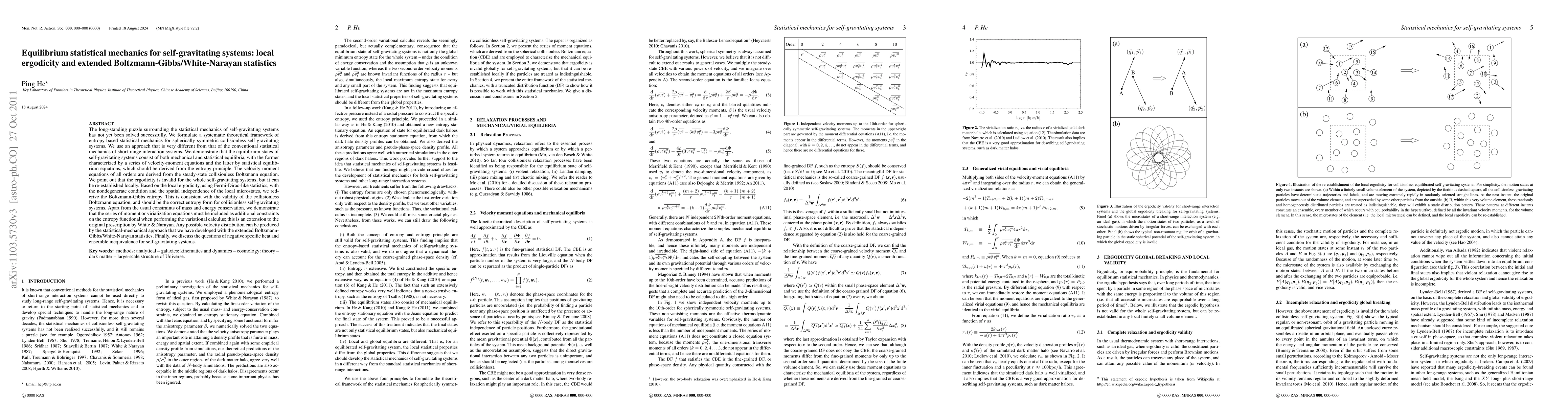 This paper develops a novel entropy-based statistical mechanics framework for spherically symmetric, collisionless self-gravitating systems, establishing local ergodicity and deriving extended Boltzmann-Gibbs/White-Narayan statistics, which accommodates the unique constraints of these systems, including virialization equations.
