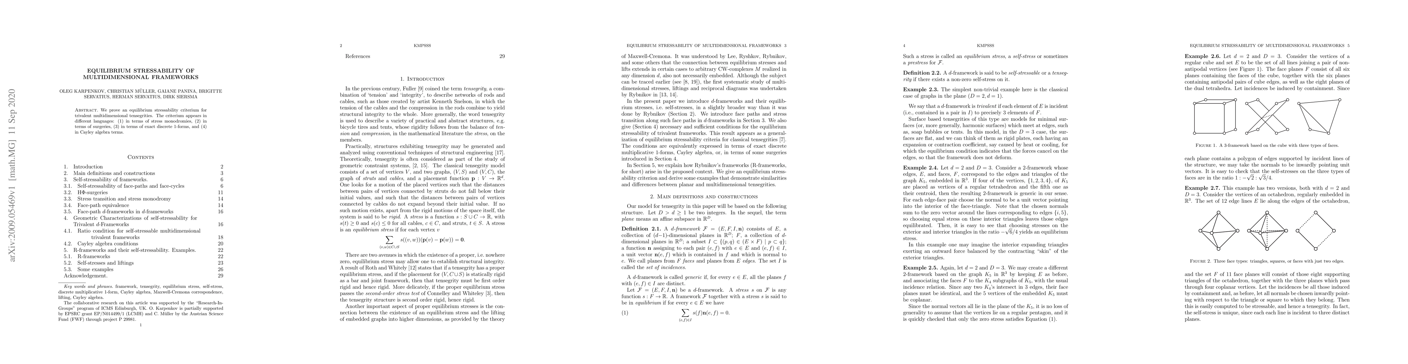 We prove an equilibrium stressability criterium for trivalent multidimensional tensegrities. The criterium appears in different languages: (1) in terms of stress monodromies, (2) in terms of surgeries, (3) in terms of exact discrete 1-forms, and (4) in Cayley algebra terms.