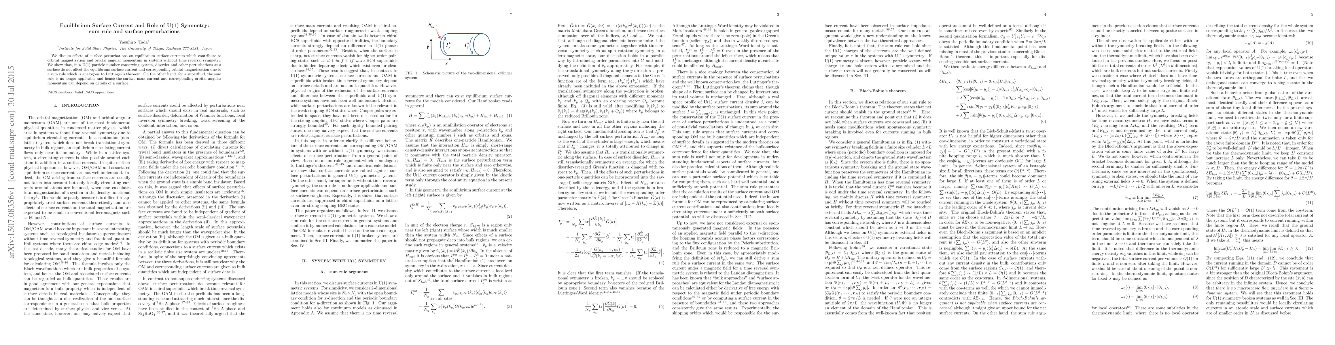 This paper investigates how surface perturbations impact equilibrium surface currents in systems lacking time reversal symmetry, demonstrating that in U(1) particle number conserving systems, a sum rule preserves these currents and magnetization, unlike in superfluids where surface details affect mass currents and angular momentum.