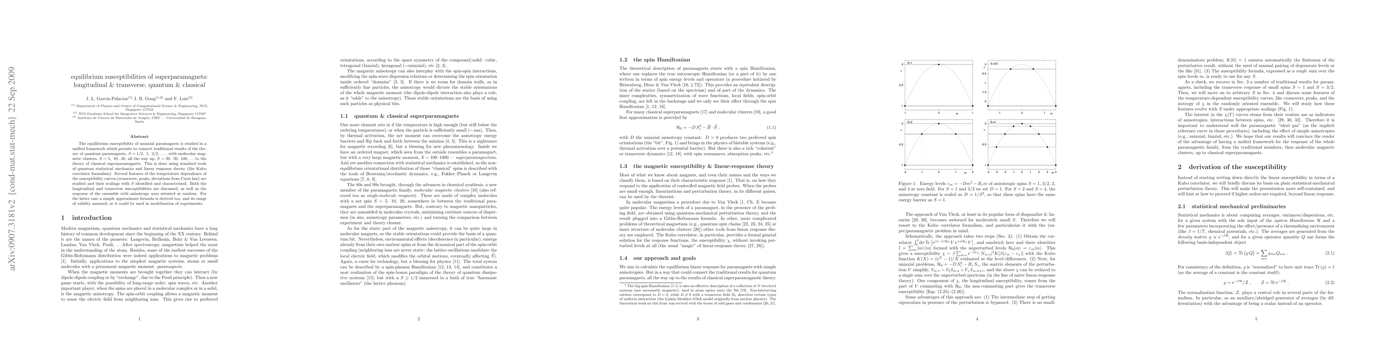 The equilibrium susceptibility of uniaxial paramagnets is studied in a unified framework which permits to connect traditional results of the theory of quantum paramagnets, $\Sm=1/2, 1, 3/2$, ..., with molecular magnetic clusters, $\Sm\sim5, 10, 20$, all the way up, $\Sm=30, 50, 100$,... to the theory of classical superparamagnets. This is done using standard tools of quantum statistical mechanics and linear response theory (the Kubo correlator formalism). Several features of the temperature dependence of the susceptibility curves (crossovers, peaks, deviations from Curie law) are studied and their scalings with $\Sm$ identified and characterized. Both the longitudinal and transverse susceptibilities are discussed, as well as the response of the ensemble with anisotropy axes oriented at random. For the latter case a simple approximate formula is derived too, and its range of validity assessed, so it could be used in modelization of experiments.