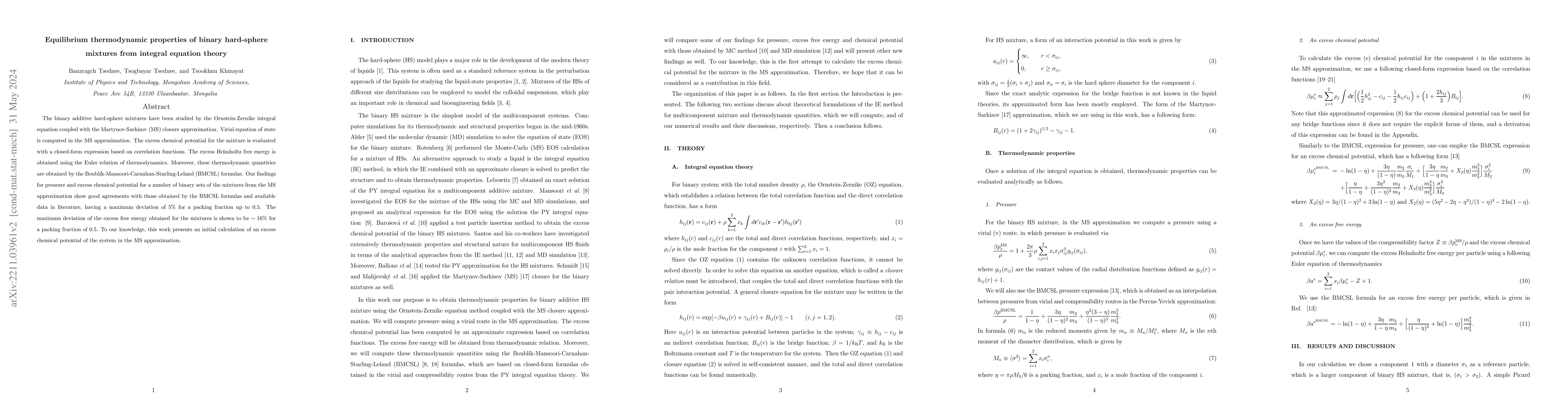 This paper employs the Ornstein-Zernike integral equation with Martynov-Sarkisov closure to study binary hard-sphere mixtures, comparing thermodynamic properties obtained from the approximation with BMCSL formulas and literature data, showing good agreement within 5% for pressure and excess chemical potential up to a packing fraction of 0.5.
