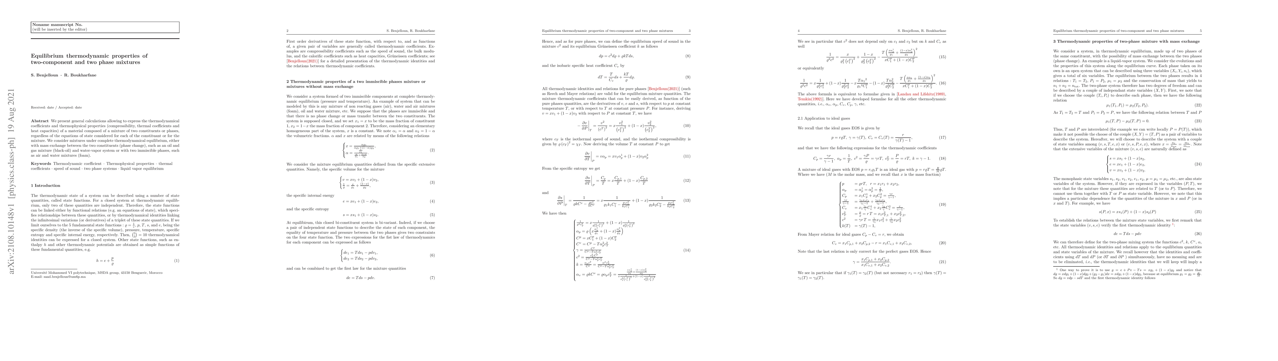 We present general calculations allowing to express the thermodynamical coefficients and thermophysical properties (compressibility, thermal coefficients and heat capacities) of a material composed of a mixture of two constituents or phases, regardless of the equations of state considered for each of the constituant or for the mixture. We consider mixtures under complete thermodynamical equilibrium, either with mass exchange between the two constituents (phase change), such as an oil and gas mixture (black-oil) and water-vapor system or with two immiscible phases, such as air and water mixtures (foam). Keywords Thermodynamic coefficient, Thermophysical properties, thermal coefficients, speed of sound, two phase systems, liquid vapor equilibrium
