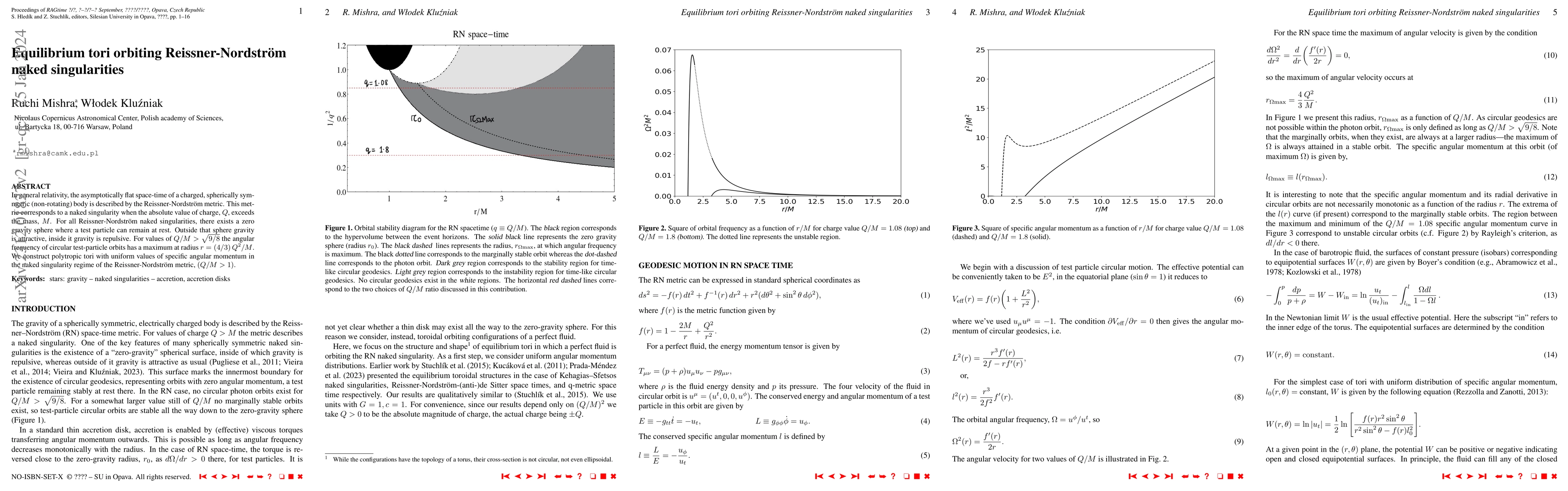 This paper explores the gravitational dynamics around Reissner-Nordström naked singularities, where the charge exceeds the mass, and constructs equilibrium tori of polytropic matter that can orbit these singularities stably. The study identifies a critical radius where the angular frequency of circular orbits reaches a maximum.