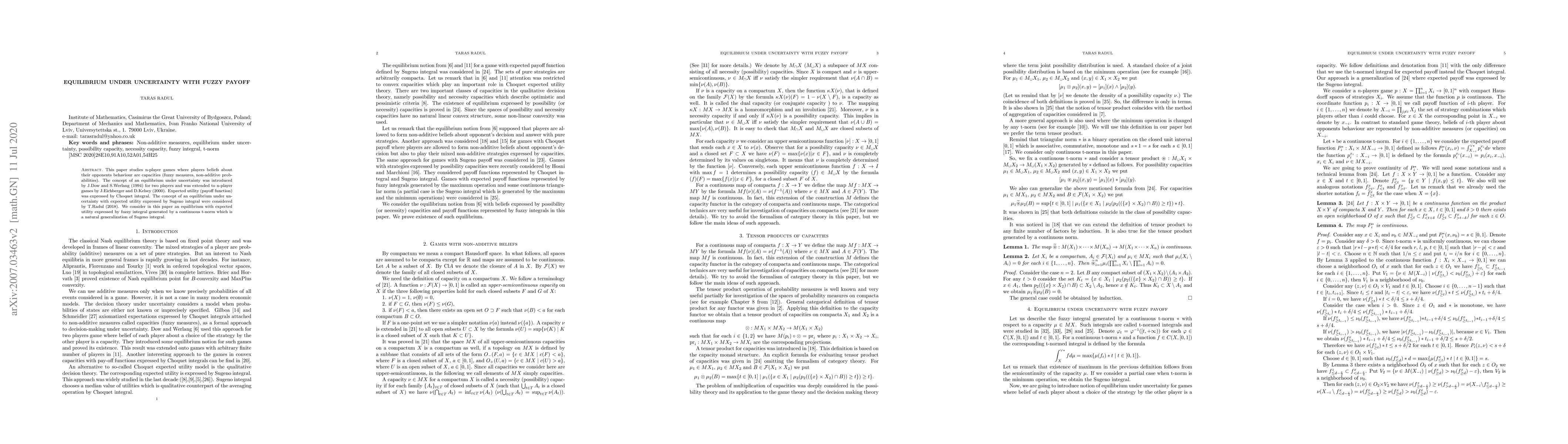 This paper studies n-player games where players beliefs about their opponents behaviour are capacities (fuzzy measures, non-additive probabilities). The concept of an equilibrium under uncertainty was introduced by J.Dow and S.Werlang (1994) for two players and was extended to n-player games by J.Eichberger and D.Kelsey (2000). Expected utility (payoff function) was expressed by Choquet integral. The concept of an equilibrium under uncertainty with expected utility expressed by Sugeno integral were considered by T.Radul (2018). We consider in this paper an equilibrium with expected utility expressed by fuzzy integral generated by a continuous t-norm which is a natural generalization of Sugeno integral.