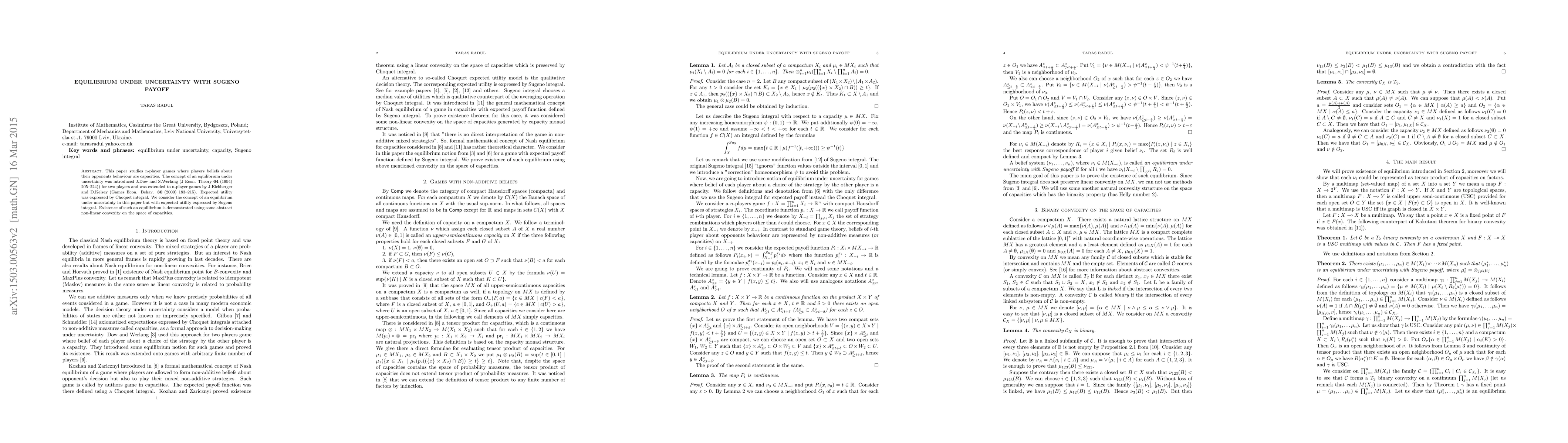 This paper explores n-player games where players' beliefs are represented by capacities, extending the concept of equilibrium under uncertainty using Sugeno integral instead of Choquet integral. The existence of such equilibria is proven through abstract non-linear convexity on the space of capacities.