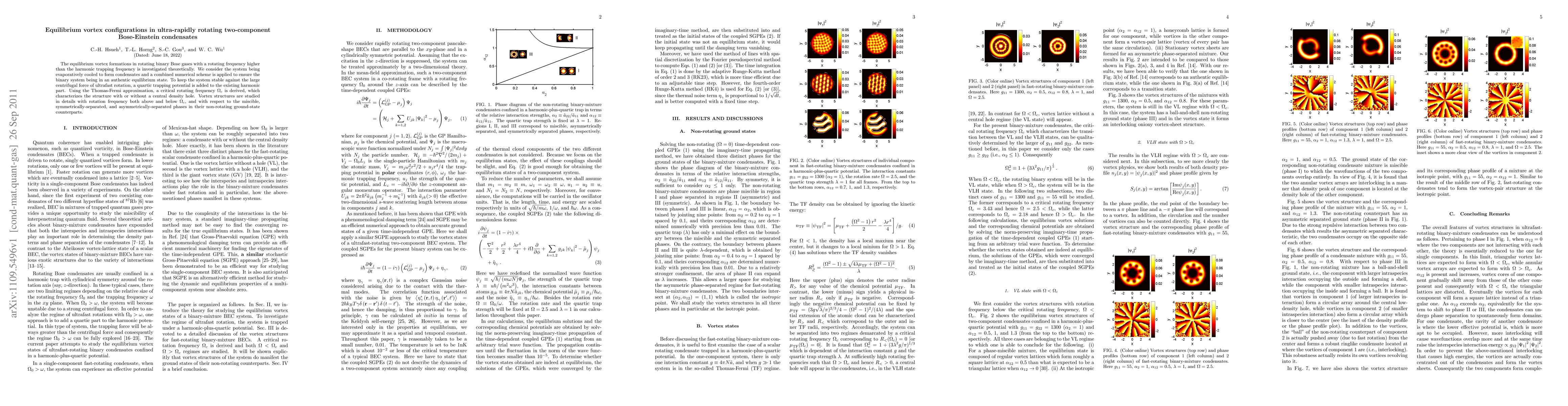 This paper investigates the equilibrium vortex formation in ultrarapidly rotating binary Bose-Einstein condensates, employing a combined numerical scheme to achieve an authentic equilibrium state. It explores the critical rotating frequency \Omega_c that determines the presence of a central density hole, and examines vortex structures under different rotation frequencies and phases.