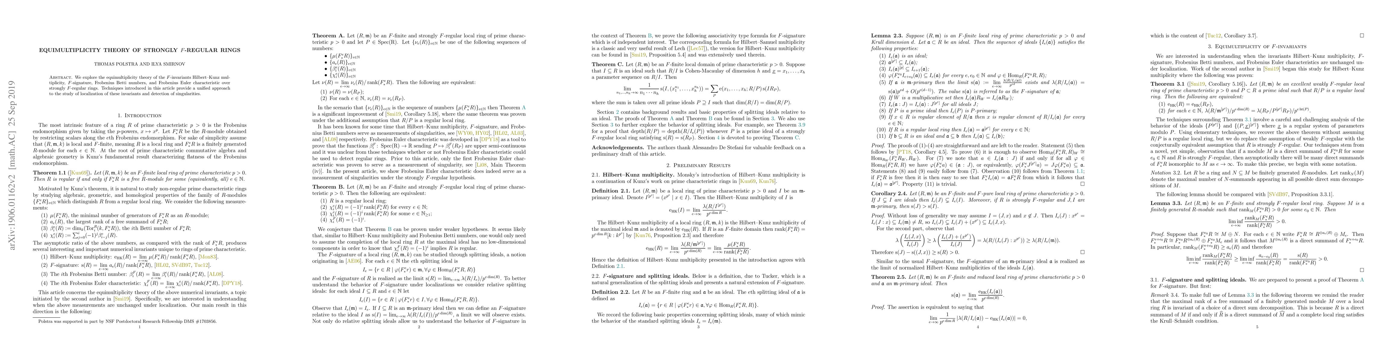 This paper investigates the equimultiplicity theory for $F$-invariants such as the Hilbert--Kunz multiplicity, $F$-signature, Frobenius Betti numbers, and Frobenius Euler characteristic in strongly $F$-regular rings, offering a unified method for studying these invariants under localization and their role in singularity measurement.