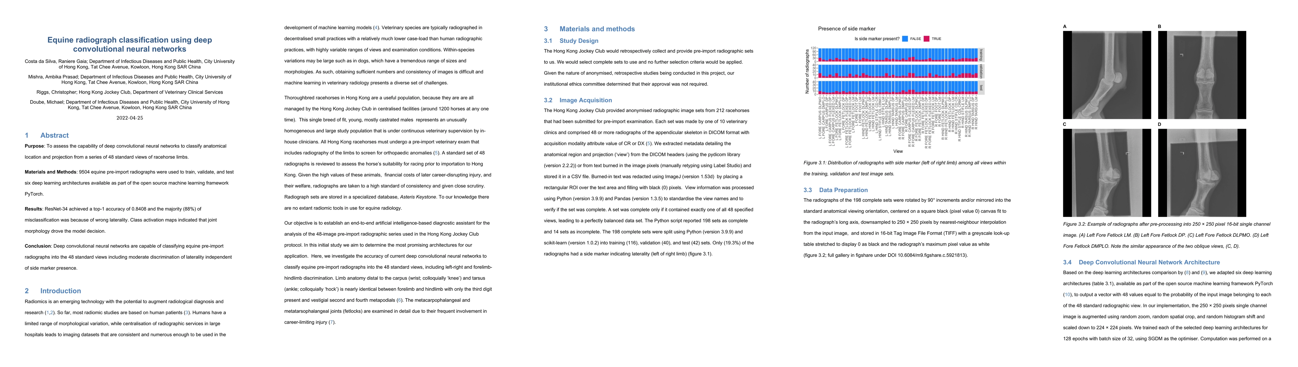 Summary: This study evaluates deep convolutional neural networks for classifying anatomical locations and projections from equine radiographs, achieving 84.08% accuracy with ResNet-34. Misclassifications primarily resulted from incorrect laterality identification, highlighting the model's reliance on joint morphology.