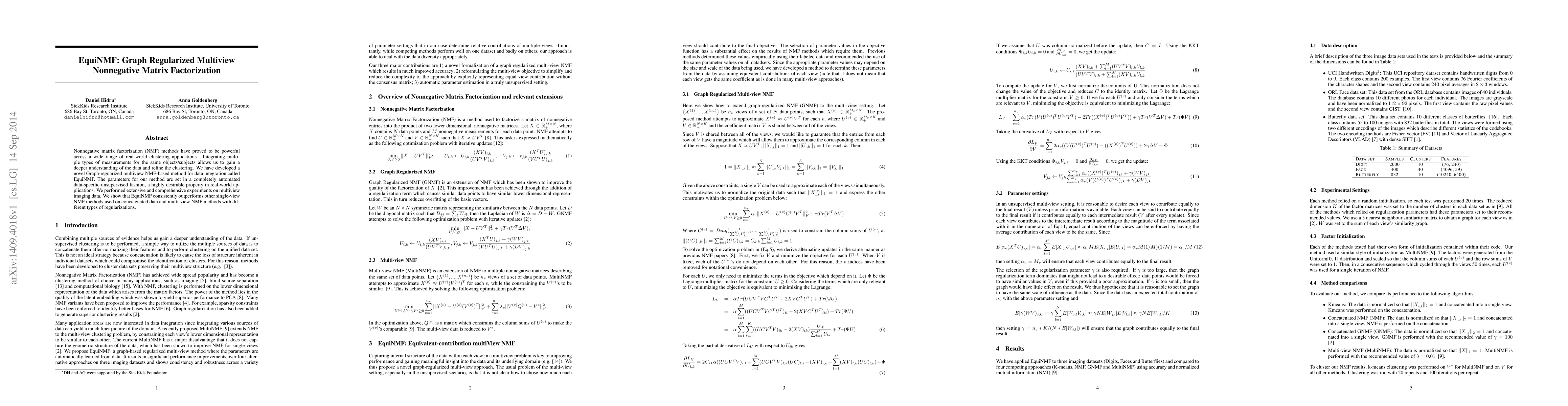 EquiNMF is a novel graph-regularized multiview NMF method for integrating multiple data types, with parameters set automatically in an unsupervised manner. Experiments demonstrate its superior performance over single-view and other multi-view NMF methods on multiview imaging data.