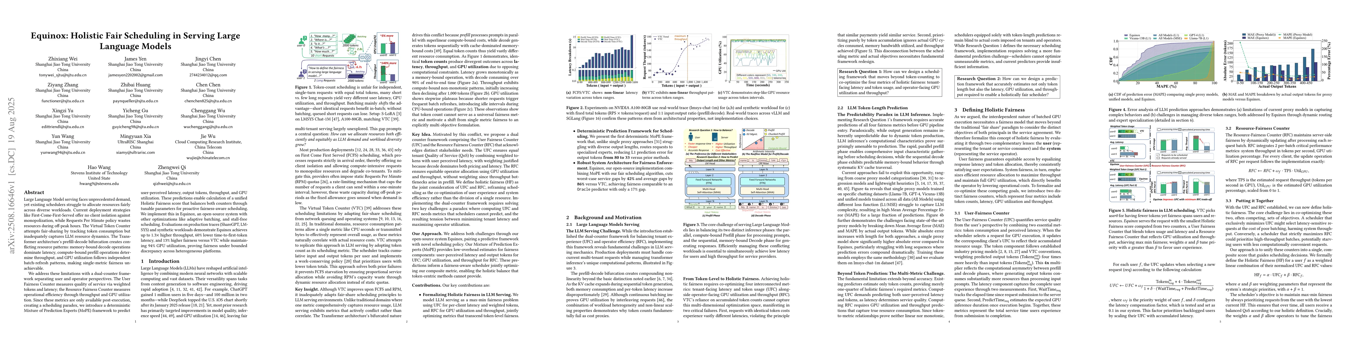 We address the limitations of current LLM serving with a dual-counter framework separating user and operator perspectives. The User Fairness Counter measures quality of service via weighted tokens and latency; the Resource Fairness Counter measures operational efficiency through throughput and GPU utilization. Since these metrics are only available post-execution, creating a scheduling paradox, we introduce a deterministic Mixture of Prediction Experts (MoPE) framework to predict user-perceived latency, output tokens, throughput, and GPU utilization. These predictions enable calculation of a unified Holistic Fairness score that balances both counters through tunable parameters for proactive fairness-aware scheduling. We implement this in Equinox, an open-source system with other optimizations like adaptive batching, and stall-free scheduling. Evaluations on production traces (ShareGPT, LMSYS) and synthetic workloads demonstrate Equinox achieves up to $1.3\times$ higher throughput, 60\% lower time-to-first-token latency, and 13\% higher fairness versus VTC while maintaining 94\% GPU utilization, proving fairness under bounded discrepancy across heterogeneous platforms.