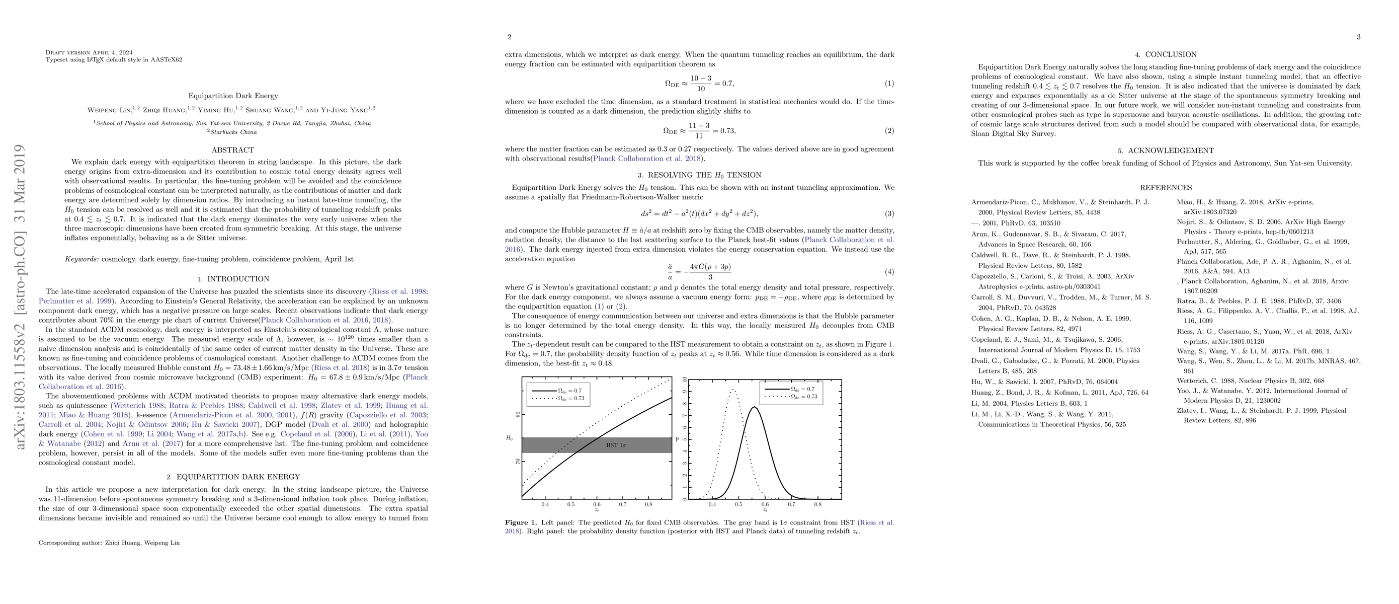 This research proposes dark energy explanation via equipartition theorem in string landscape, suggesting a novel approach in understanding cosmic acceleration.