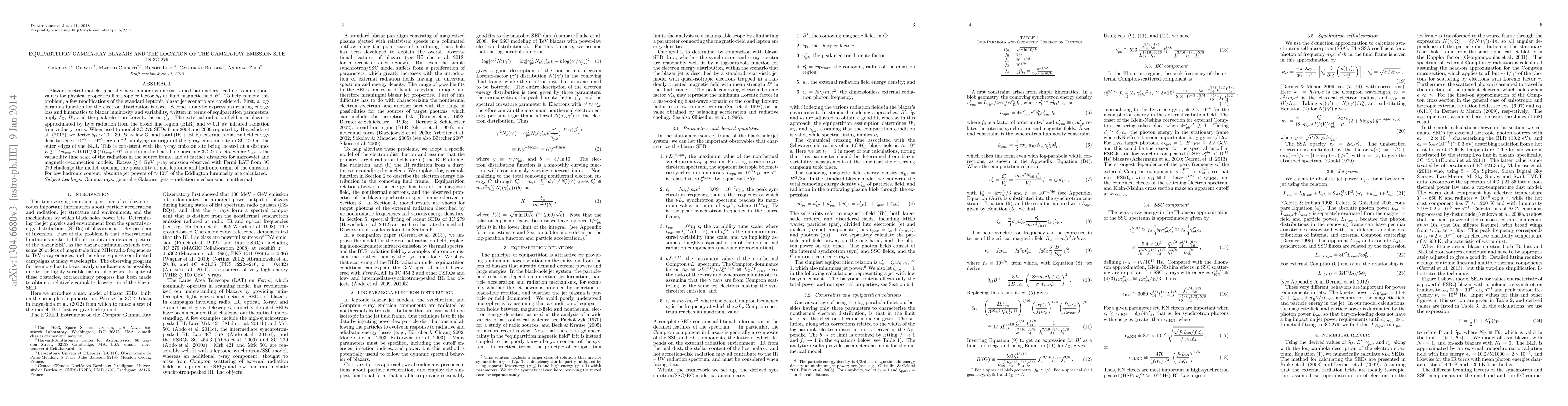 Blazar spectral models generally have numerous unconstrained parameters, leading to ambiguous values for physical properties like Doppler factor delta or fluid magnetic field B'. To help remedy this problem, a few modifications of the standard leptonic blazar jet scenario are considered. First, a log-parabola function for the electron distribution is used. Second, analytic expressions relating energy loss and kinematics to blazar luminosity and variability, written in terms of equipartition parameters, imply delta, B', and the principal electron Lorentz factor gamma'_pk. The external radiation field in a blazar is approximated by Ly alpha radiation from the broad line region (BLR) and ~0.1 eV infrared radiation from a dusty torus. When used to model 3C 279 SEDs from 2008 and 2009 reported by Hayashida et al. (2012), we derive delta ~ 20-30, B' ~ few G, and total (IR + BLR) external radiation field energy densities u ~ 0.01 - 0.001 erg/cm^3, implying an origin of the gamma-ray emission site in 3C 279 at the outer edges of the BLR. This is consistent with the gamma-ray emission site being located at a distance R <~ Gamma^2 c t_{var} ~ 0.1 (\Gamma/30)^2 (t_{var}/10^4 s) pc from the black hole powering 3C 279's jets, where t_{var} is the variability time scale of the radiation in the source frame, and at farther distances for narrow-jet and magnetic_reconnection models. Excess >~ 5 GeV gamma-ray emission observed with Fermi LAT from 3C 279 challenge the model, opening the possibility of hadronic origins of the emission. For low hadronic content, absolute jet powers of ~10% of the Eddington luminosity are calculated.