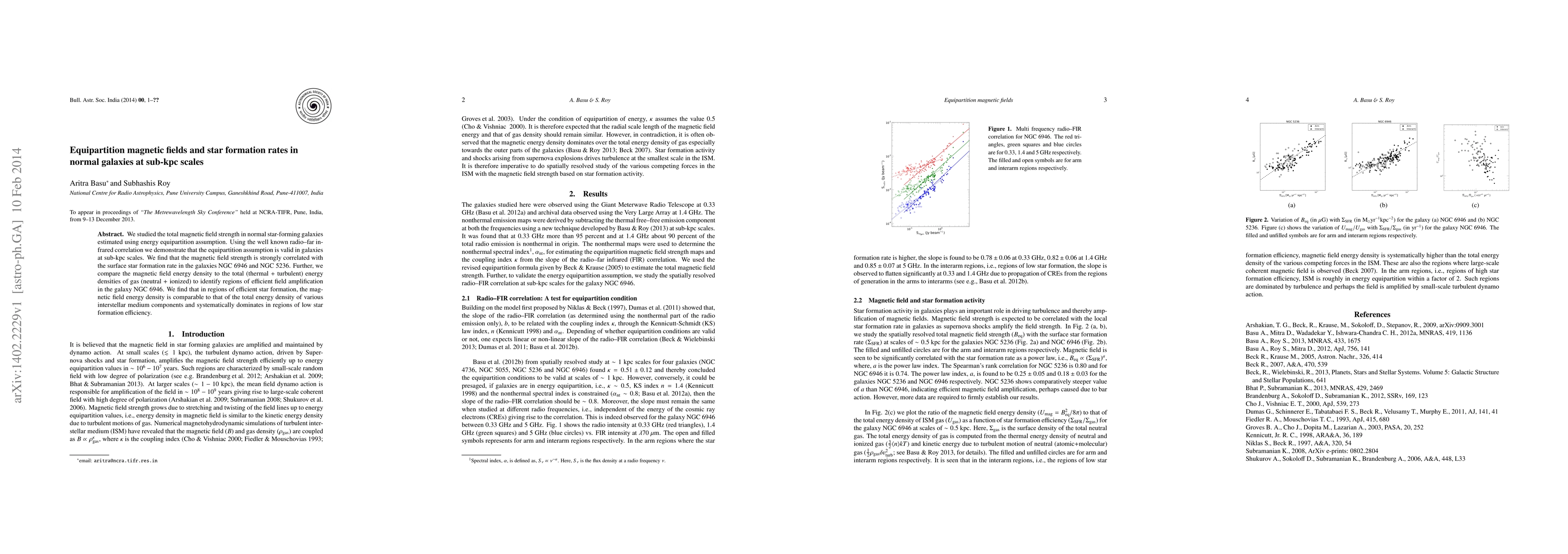 This study estimates the magnetic field strength in normal star-forming galaxies using the equipartition assumption, finding a strong correlation between magnetic field strength and surface star formation rates in NGC 6946 and NGC 5236. It also reveals that magnetic fields dominate in regions of low star formation efficiency compared to the total energy density of interstellar medium components.