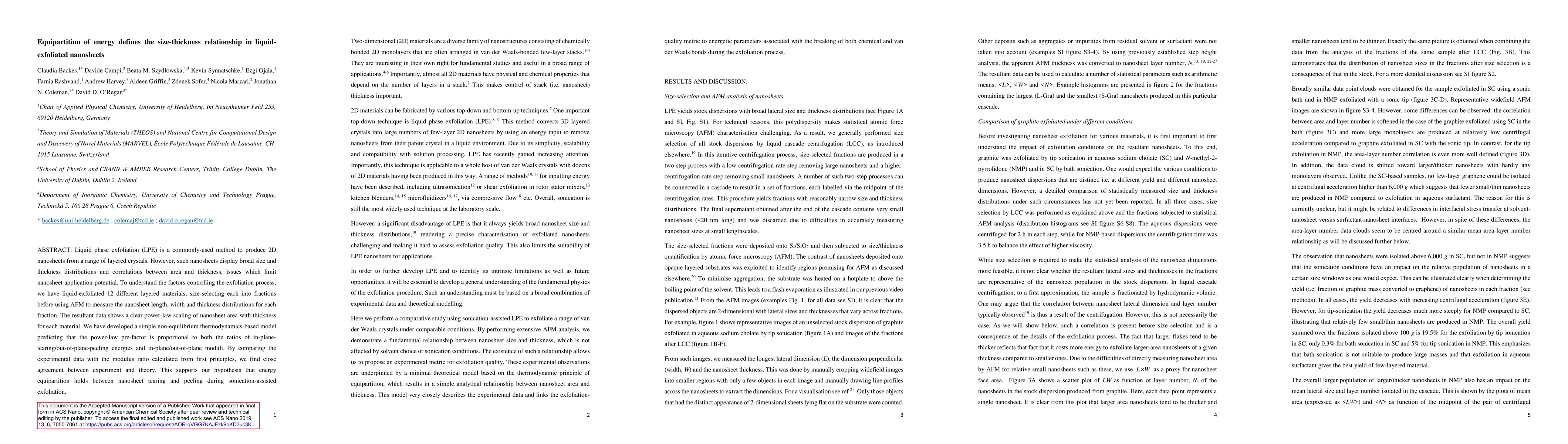 This paper investigates the relationship between size and thickness in liquid-exfoliated 2D nanosheets, revealing a power-law scaling. A thermodynamics-based model suggests that the equipartition of energy during sonication drives the observed size-thickness correlation, supported by close agreement between experimental data and theoretical predictions.