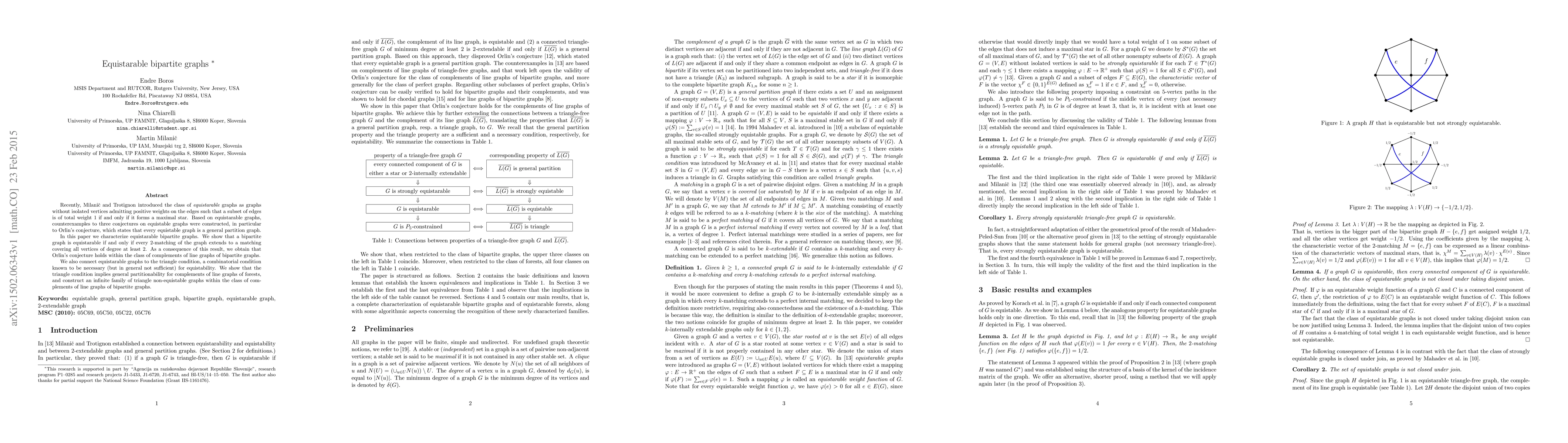 This paper characterizes equistarable bipartite graphs, showing that they exist if every 2-matching extends to a matching covering all vertices of degree at least 2, with implications for Orlin's conjecture and the triangle condition.