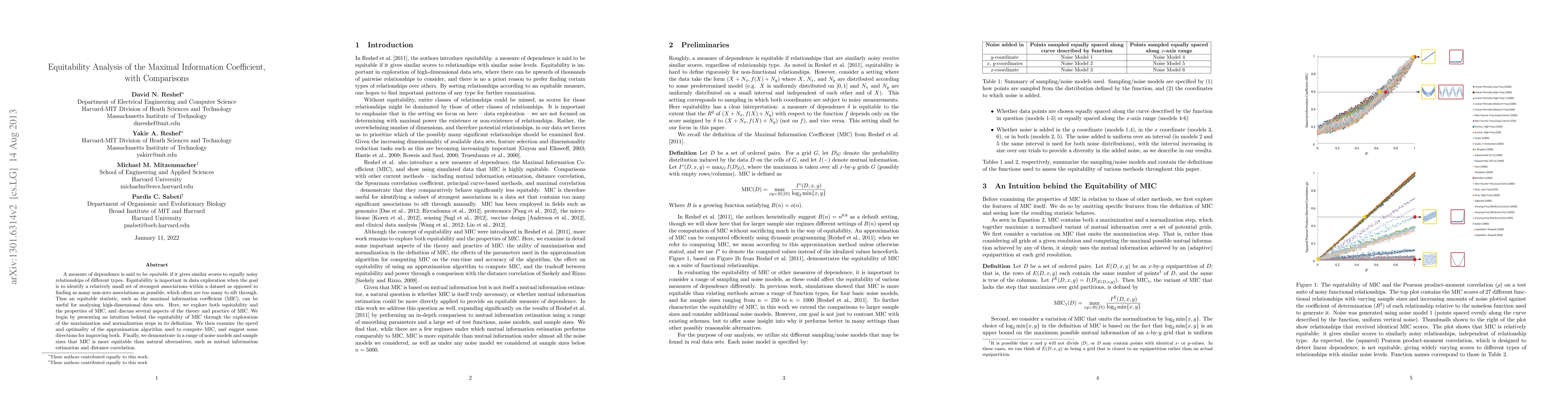 A measure of dependence is said to be equitable if it gives similar scores to equally noisy relationships of different types. Equitability is important in data exploration when the goal is to identify a relatively small set of strongest associations within a dataset as opposed to finding as many non-zero associations as possible, which often are too many to sift through. Thus an equitable statistic, such as the maximal information coefficient (MIC), can be useful for analyzing high-dimensional data sets. Here, we explore both equitability and the properties of MIC, and discuss several aspects of the theory and practice of MIC. We begin by presenting an intuition behind the equitability of MIC through the exploration of the maximization and normalization steps in its definition. We then examine the speed and optimality of the approximation algorithm used to compute MIC, and suggest some directions for improving both. Finally, we demonstrate in a range of noise models and sample sizes that MIC is more equitable than natural alternatives, such as mutual information estimation and distance correlation.