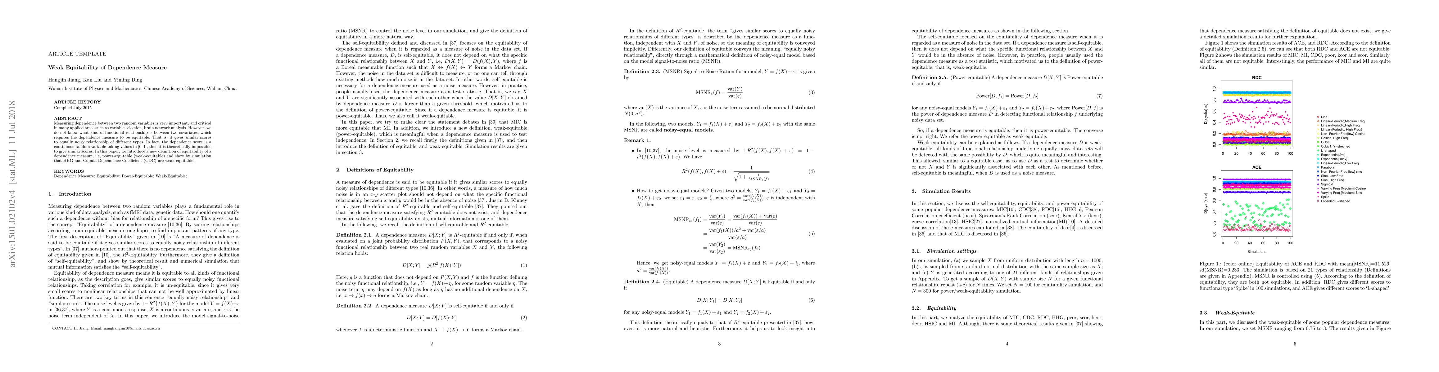 A new definition of equitability is introduced for dependence measures, showing that HHG and Copula Dependence Coefficient (CDC) are weak-equitable, indicating they can detect similar relationships in various types of noise.