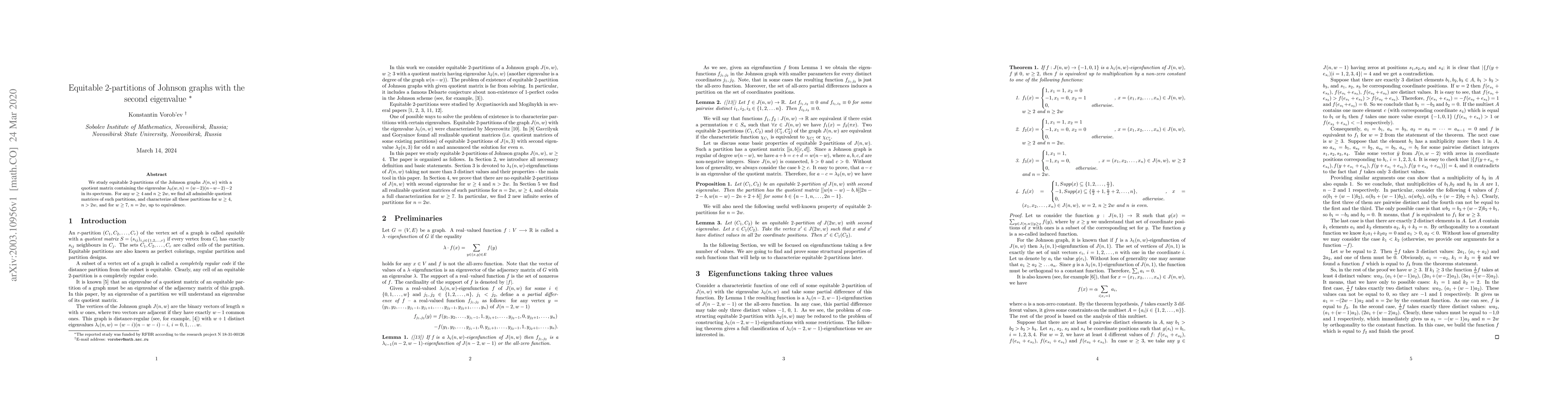 This paper investigates equitable 2-partitions of Johnson graphs J(n,w) with a quotient matrix featuring the second eigenvalue λ_2(w,n). It identifies all admissible quotient matrices and characterizes partitions for specific conditions on w and n, up to equivalence.
