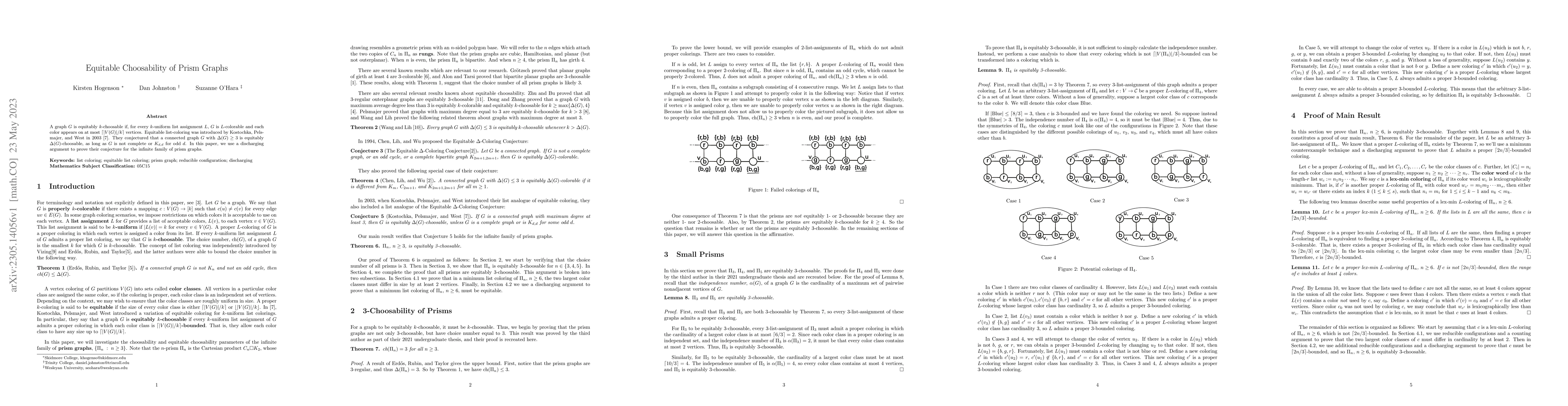 This paper proves that prism graphs are equitably $\Delta(G)$-choosable using a discharging argument, confirming a conjecture by Kostochka, Pelsmajer, and West for this specific infinite family of graphs.